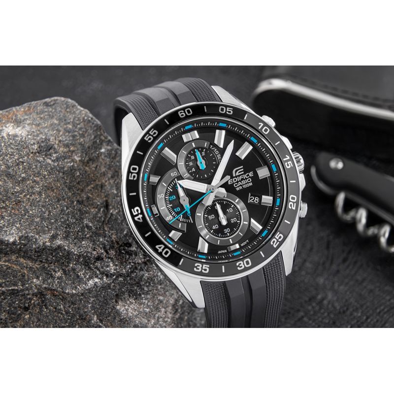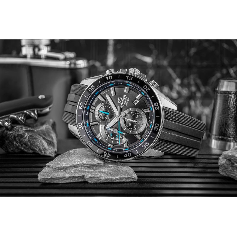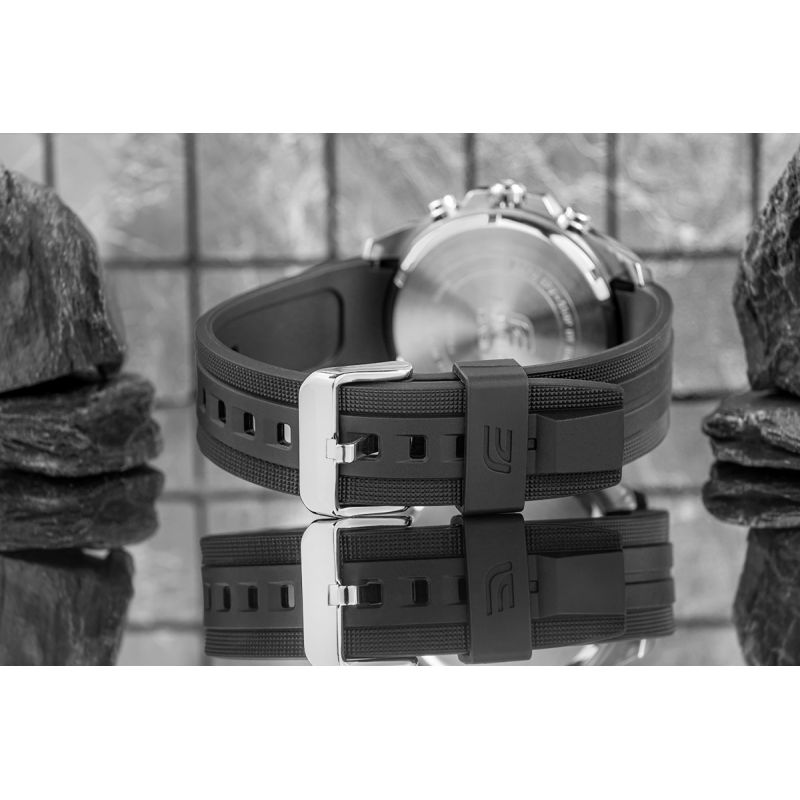Duży standardowy chronograf EDIFICE o dynamicznym designie orazelastycznym, wytrzymałym paskiem z żywicy. Model zainspirowany motorsportem, wyróżnia się dynamicznymi kombinacjami kolorów i wyrazistymi tarczami pomocniczymi, tworząc styl, który emanuje szybkością. Zegarek wyposażony w funkcję daty dni miesiąca oraz chronografy: stoper 1/10 sekundy, stoper minutowy oraz stoper sekundowy. Dzięki wodoszczelności 10 BAR możesz śmiało zabrać go na basen, trening czy wodną przygodę, a fluorescencyjne podświetlenie sprawia, że nawet po zmroku masz pełną kontrolę nad czasem.