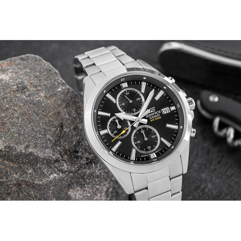 Znajdź idealną harmonię stylu i precyzji z klasycznym, średniej wielkości chronografem EDIFICE.Wyrafinowane połączenie dopracowanych detali i nowoczesnego designu wyróżnia się cienkim bezelem, który kontrastuje z szeroką tarczą, nadając zegarkowi wyrazisty, elegancki charakter.Wyposażony w funkcjędaty dni miesiąca oraz chronografy: wskaźnik 24-godzinny, minuty stopera, sekundy stopera.Dzięki wodoszczelności 10 BAR możesz śmiało zabrać go na basen, trening czy wodną przygodę. Fluorescencyjne podświetlenie sprawia, że nawet po zmroku masz pełną kontrolę nad czasem.