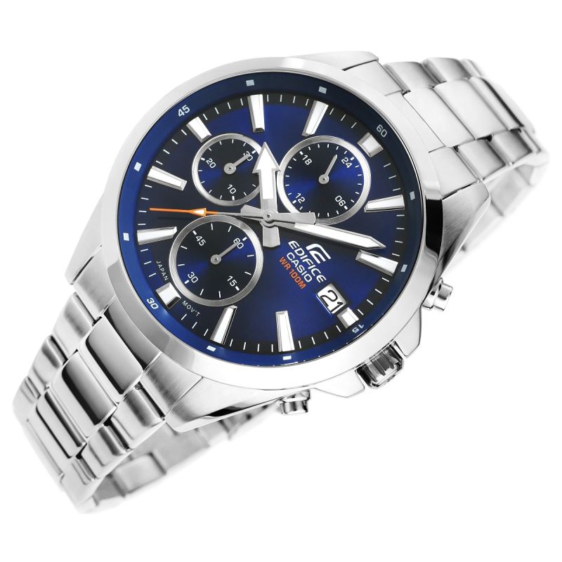 Znajdź idealną harmonię stylu i precyzji z klasycznym, średniej wielkości chronografem EDIFICE.Wyrafinowane połączenie dopracowanych detali i nowoczesnego designu wyróżnia się cienkim bezelem, który kontrastuje z szeroką tarczą, nadając zegarkowi wyrazisty, elegancki charakter.Wyposażony w funkcjędaty dni miesiąca oraz chronografy: wskaźnik 24-godzinny, minuty stopera, sekundy stopera.Dzięki wodoszczelności 10 BAR możesz śmiało zabrać go na basen, trening czy wodną przygodę. Fluorescencyjne podświetlenie sprawia, że nawet po zmroku masz pełną kontrolę nad czasem.
