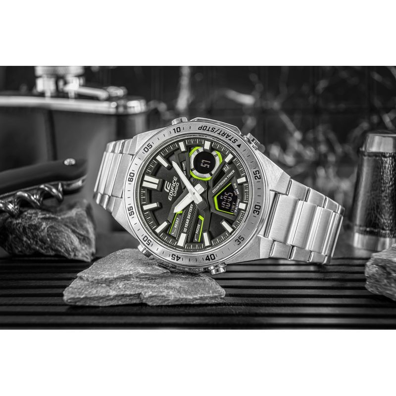Wszechstronny zegarek dla aktywnych i wymagających. Analogowo-cyfrowy czasomierz EDIFICE EFV-C110 zapewnia precyzję i funkcjonalność na lata – 10-letnia bateria sprawia, że możesz zapomnieć o jej wymianie na długi czas. Dynamiczny, sportowy design podkreśla głębia i trójwymiarowość tarczy, a cyfrowe wyświetlacze oferują szeroki wachlarz funkcji, w tym czas światowy, stoper 1/100 sekundy i minutnik odliczający. Model posiada równieżTelememo z możliwością zapisania 30 numerów telefonów, zawierających do 12 cyfr z nazwą do 8 znaków. Skup się na życiu i wybierz EDIFICE EFV-C110 - zegarek, który Cię nie zawiedzie.