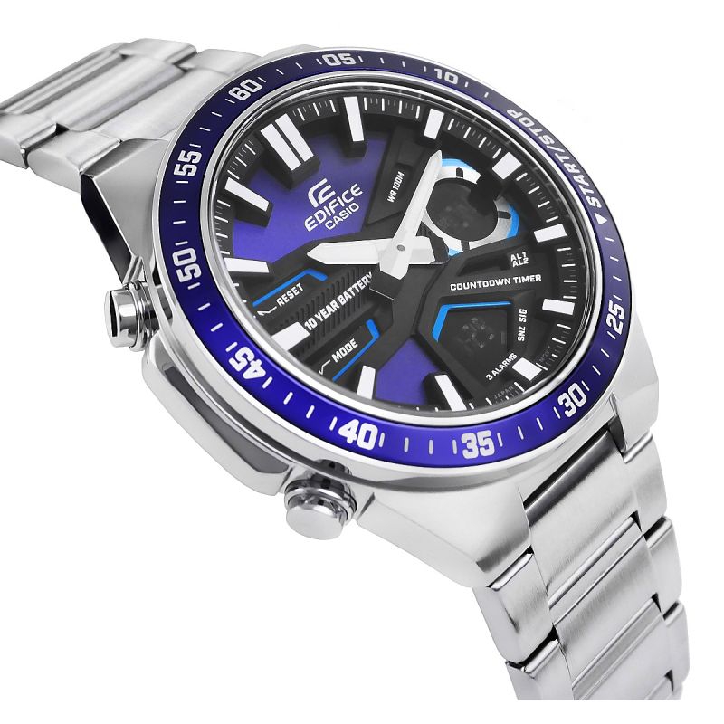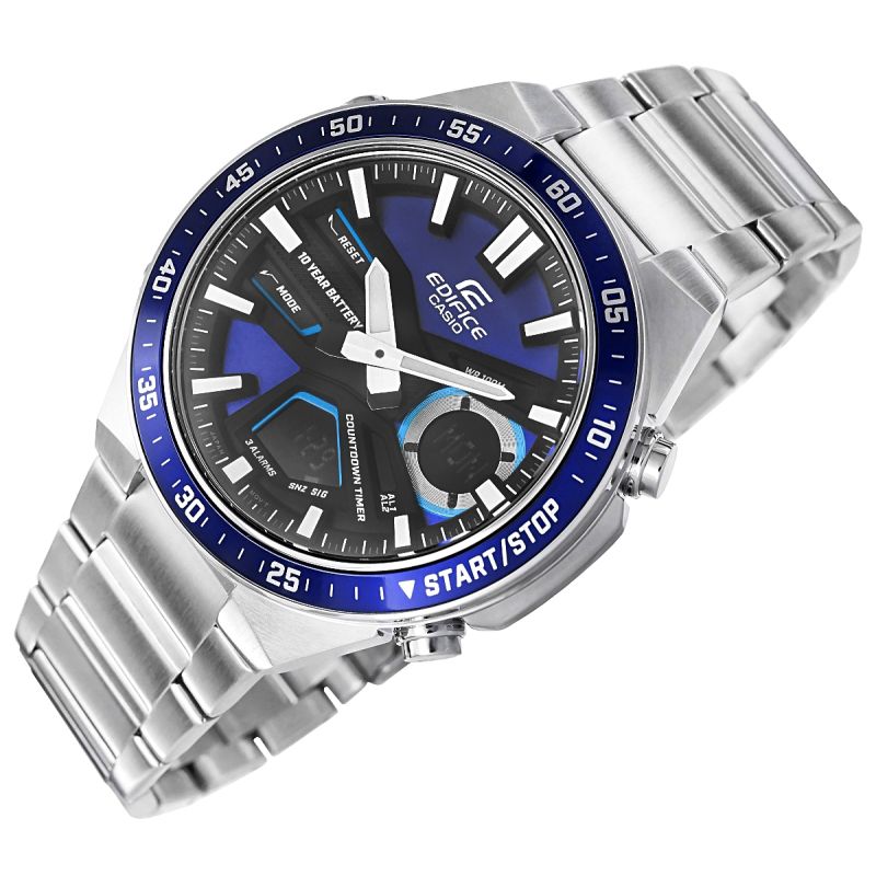 Wszechstronny zegarek dla aktywnych i wymagających. Analogowo-cyfrowy czasomierz EDIFICE EFV-C110 zapewnia precyzję i funkcjonalność na lata – 10-letnia bateria sprawia, że możesz zapomnieć o jej wymianie na długi czas. Dynamiczny, sportowy design podkreśla głębia i trójwymiarowość tarczy, a cyfrowe wyświetlacze oferują szeroki wachlarz funkcji, w tym czas światowy, stoper 1/100 sekundy i minutnik odliczający. Model posiada równieżTelememo z możliwością zapisania 30 numerów telefonów, zawierających do 12 cyfr z nazwą do 8 znaków. Skup się na życiu i wybierz EDIFICE EFV-C110 - zegarek, który Cię nie zawiedzie.