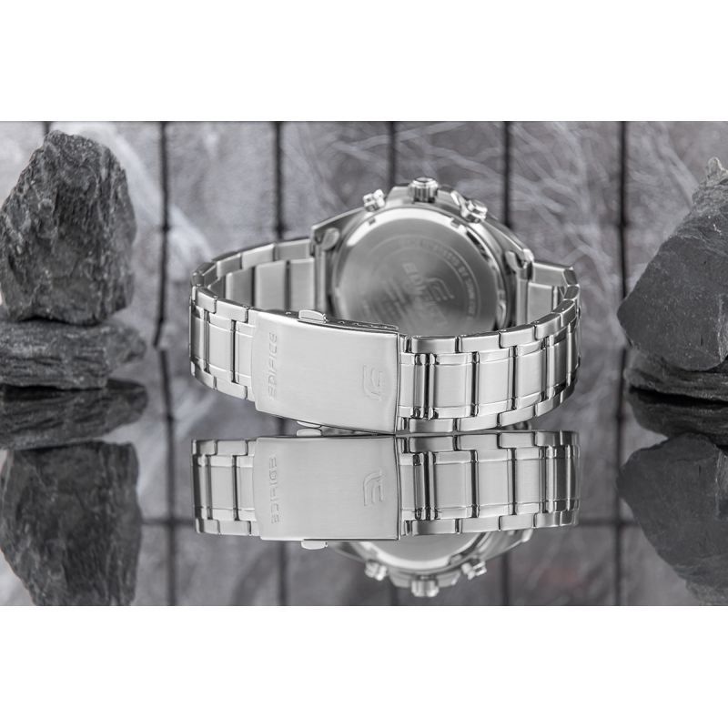 Komfortowa, stalowa bransoleta to znakomite uzupełnienie tego zegarka. Rodzaj bransolety jest gwarancją solidności i wygody podczas codziennego użytkowania. Komfort dopełnia odpowiednia jakość stali, która komfortowo dopasowuje się do męskiego nadgarstka. Zapięcie sygnowane jest logiem marki Edifice, co podnosi prestiż zegarka i zapewnia wyjątkowość na tle innych marek zegarków.