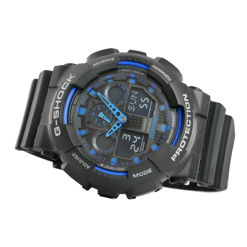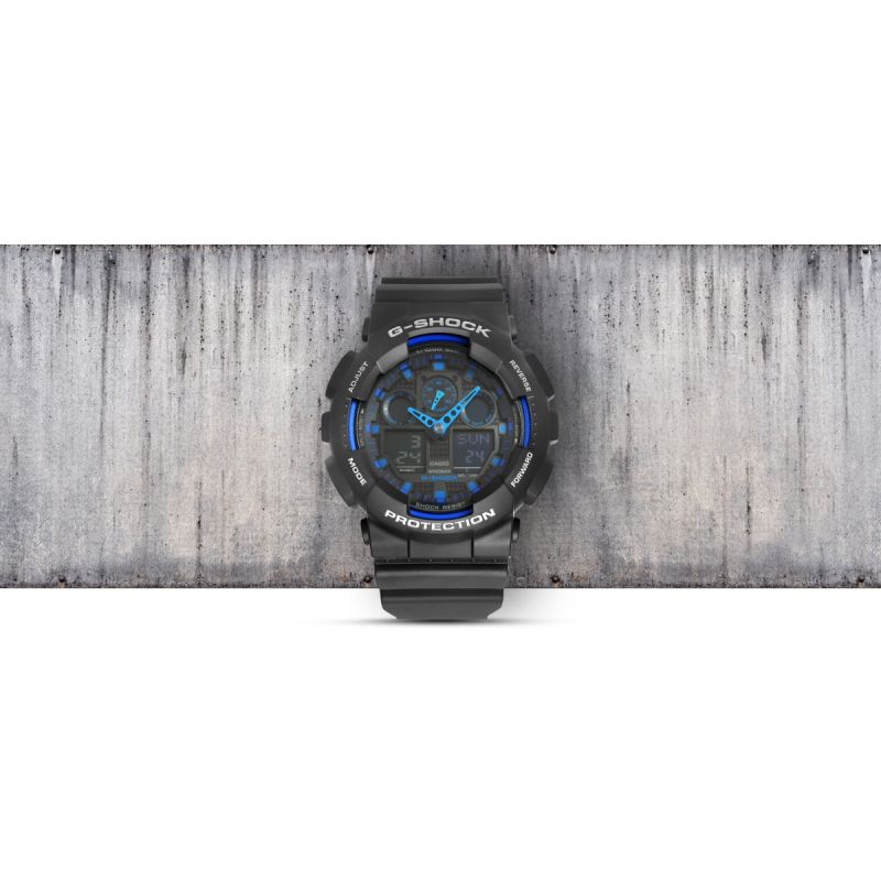 Zegarek Męski CASIO G-SHOCK GA-100-1A2ER wyposażony jest w: Stoper, Alarmx5, Budzik. Data.. Podświetlenie - do podświetlenia tego zegarka użyto diody LED, która stonowanym i jasnym światłem wystarczająco naświetli nam tarczę. Czas światowy, odczyt różnych stref czasowych. Kalendarz automatyczny z zaprogramowanymi datami do 2099r., Zegarek sam dostosowuje daty w przypadku krótszych miesięcy. Timer 1/10 - sec. Zegarek wyposażony jest w funkcję liczącą czas do tyłu, możliwość ustawienia od 1 sec do 24 godzin.