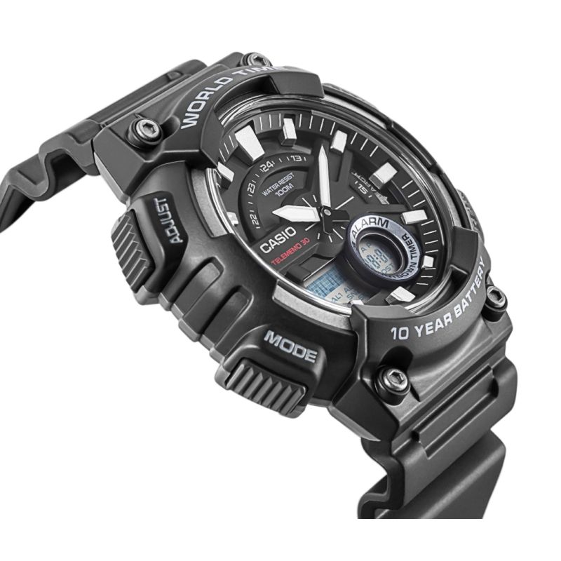 Model Casio AEQ-110W z wyrazistą metaliczną tarczą 3D i elementami w kolorze srebra sprawdza się zarówno w codziennym biegu po mieście, jak i w terenie – podczas wypadu za miasto czy weekendowego survivalu. Ten model nie potrzebuje taryfy ulgowej – został stworzony dla tych, którzy oczekują, że sprzęt będzie działać zawsze i wszędzie. 10 lat spokoju na jednej baterii, wodoszczelność 100 metrów (10 BAR), a do tego funkcje, które naprawdę się przydają: czas światowy w 30 miastach (29 stref czasowych),stoper 1/100 sekundy do zadań specjalnych, 3 alarmy dzienne, żeby nic Ci nie umknęło, i Telememo 30 – byś miał ważne kontakty pod ręką, nawet bez dostępu do telefonu.To zegarek, który nie tylko wygląda konkretnie – on po prostu jest konkretny.