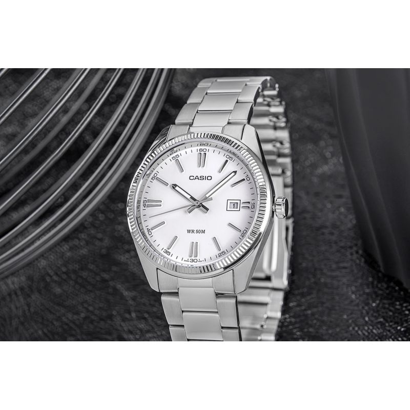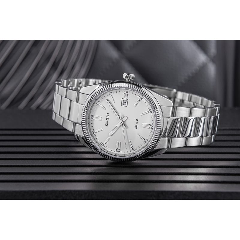 Zegarek Męski Casio MTP-1302PD-7A1VEF to klasyczny czasomierz, który łączy elegancję z prostotą. Jasna tarcza z wyraźnymi indeksami i datownikiem przy godzinie 3 jest bardzo czytelna i stylowa, a stalowa koperta i bransoleta nadają mu solidny, ponadczasowy charakter.
