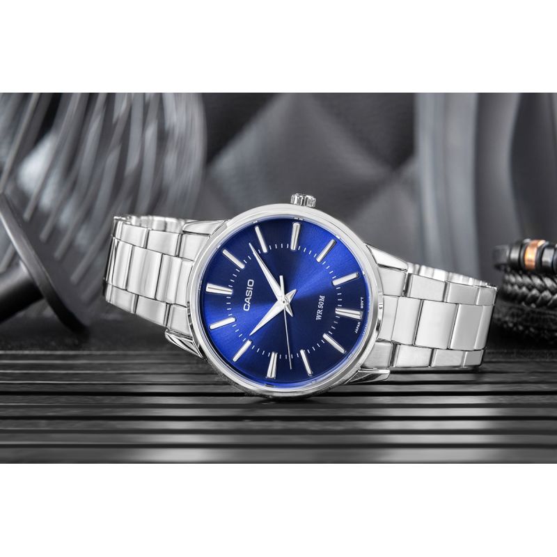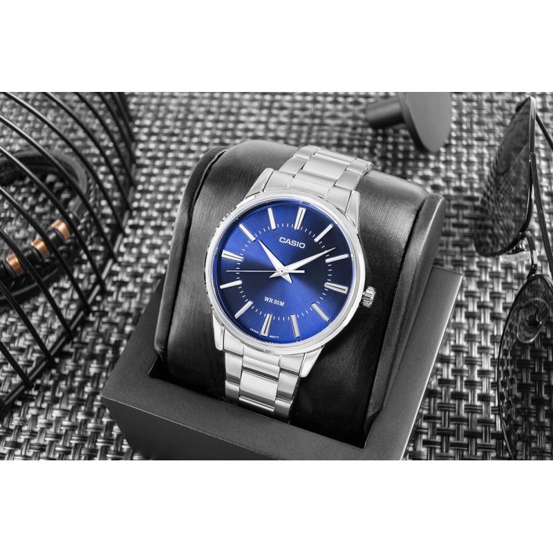Bransoleta w tym modelu podkreśla ponadczasowy styl zegarka i nadaje mu bardziej uporządkowanego, klasycznego wyglądu. Srebrne wykończenie świetnie współgra z niebieską, metaliczną tarczą, tworząc spójną i elegancką całość, która prezentuje się schludnie i uniwersalnie.