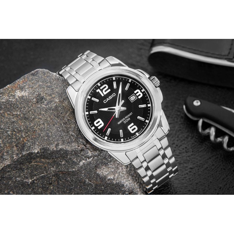 Model CASIO MTP-1314PD-1AVEF łączy w sobie ponadczasowy design z codzienną praktycznością. Czarna tarcza z delikatną teksturą i wyraźnie zaznaczonymi indeksami oferuje doskonałą czytelność. Duże cyfry arabskie na godzinie 12, 3, 6 i 9 w połączeniu ze smukłymi wskazówkami tworzą nowoczesną kompozycję, podkreśloną przez subtelny czerwony sekundnik. Datownik umieszczony na trzeciej godzinie dodaje funkcjonalności, nie zakłócając harmonii projektu. Stalowa koperta i bransoleta o satynowym wykończeniu nadają zegarkowi elegancji, która sprawdzi się zarówno w biurze, jak i na co dzień. Wodoodporność do 50M zapewnia niezawodność w różnych warunkach. Casio MTP – wybór mężczyzny, który stawia na solidność, styl i ponadczasową estetykę.