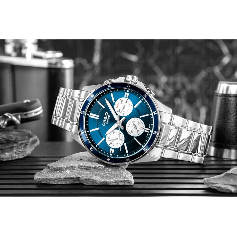 CASIO MTP-1374D-2A3VDFto coś więcej niż zwykły zegarek – to niezawodny partner dla mężczyzny, który chce wyglądać stylowo w każdej sytuacji. Elegancka forma z nutą sportowego charakteru sprawia, że świetnie odnajduje się zarówno przy koszuli, jak i przy codziennym T-shircie. Wyrazisty kontrast tarczy przyciąga wzrok i podkreśla precyzyjne detale, a stalowa koperta i bransoleta z powłoką jonową (ion plated) zapewniają trwałość i odporność na zarysowania. Praktyczne subtarcze – dzień, data i czas 24-godzinny – pozwalają mieć wszystko pod kontrolą jednym rzutem oka. Dokładny mechanizm (±20 sekund/miesiąc) i wodoszczelność do 50 metrów sprawiają, że możesz go nosić bez obaw – w pracy, w podróży, nawet w deszczu. To klasyczny metalowy zegarek analogowy, który nie tylko wygląda dobrze, ale też działa wtedy, gdy go potrzebujesz.