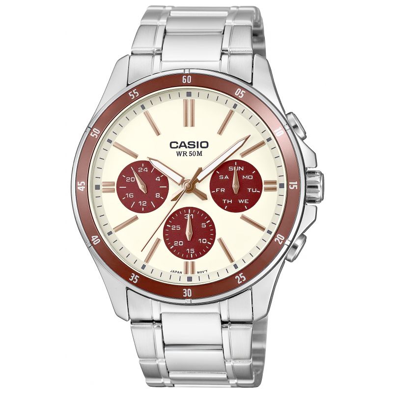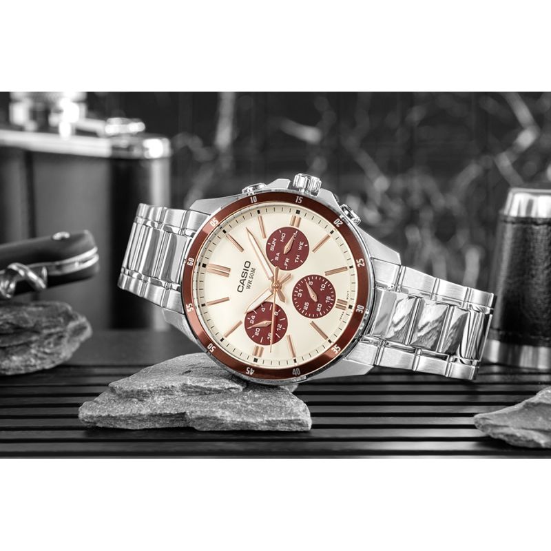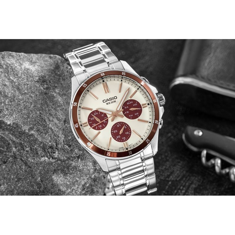 CASIO MTP-1374D-5A2VDFto coś więcej niż zwykły zegarek – to niezawodny partner dla mężczyzny, który chce wyglądać stylowo w każdej sytuacji. Elegancka forma z nutą sportowego charakteru sprawia, że świetnie odnajduje się zarówno przy koszuli, jak i przy codziennym T-shircie. Wyrazisty kontrast tarczy przyciąga wzrok i podkreśla precyzyjne detale, a stalowa koperta i bransoleta z powłoką jonową (ion plated) zapewniają trwałość i odporność na zarysowania. Praktyczne subtarcze – dzień, data i czas 24-godzinny – pozwalają mieć wszystko pod kontrolą jednym rzutem oka. Dokładny mechanizm (±20 sekund/miesiąc) i wodoszczelność do 50 metrów sprawiają, że możesz go nosić bez obaw – w pracy, w podróży, nawet w deszczu. To klasyczny metalowy zegarek analogowy, który nie tylko wygląda dobrze, ale też działa wtedy, gdy go potrzebujesz.