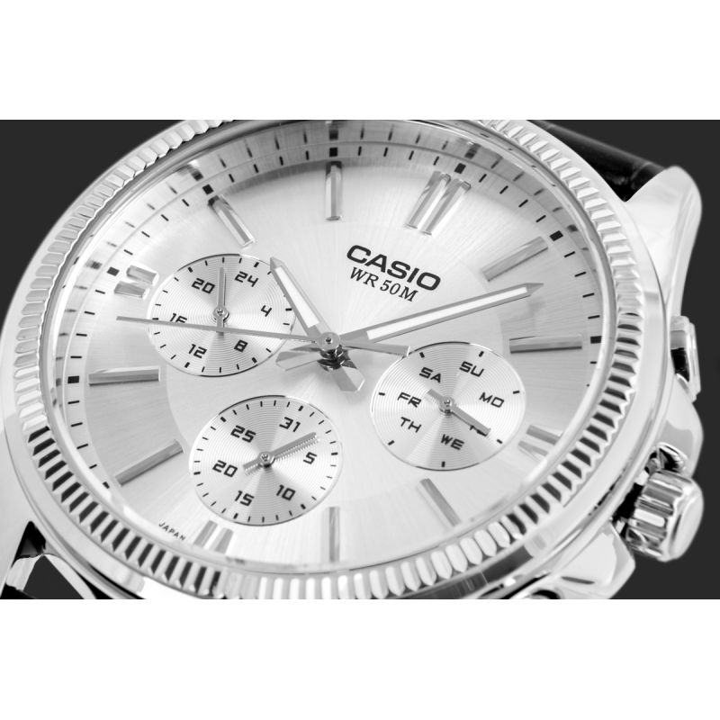CASIO MTP-1375L-1AVDF to zegarek dla mężczyzny, który lubi mieć wszystko pod kontrolą – styl, czas i jakość. Srebrna tarcza z subtelnym efektem głębi i srebrnymi detalami doskonale komponuje się z czarnym skórzanym paskiem, tworząc stylowy duet – idealny zarówno do koszuli, jak i do luźniejszego outfitu. Subtarcze pokazujące dzień tygodnia, datę i godzinę w trybie 24h dają Ci pełen obraz sytuacji za jednym spojrzeniem, bez sięgania po telefon. Wodoszczelność do 50 metrów i dokładność mechanizmu (±20 sekund/miesiąc) to spokój ducha – nie musisz się martwić o pogodę, przypadkowe zachlapania czy spóźnienia. Całość tworzy wyrazisty, męski styl, który przyciąga spojrzenia i sprawia, że zegarek prezentuje się znacznie powyżej swojej klasy cenowej.