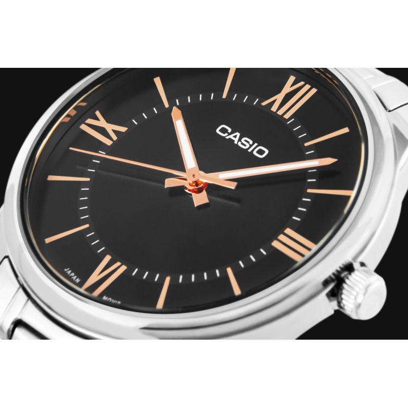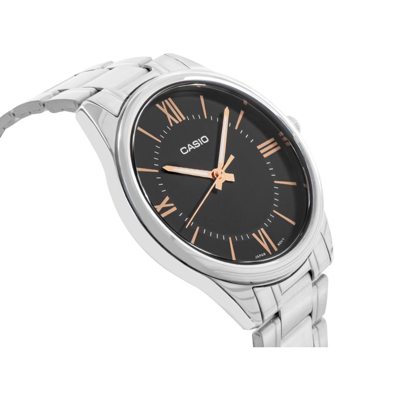Wyróżnij się stylem zarówno w pracy, jak i podczas czasu wolnego dzięki linii eleganckich zegarków Casio MTP-V005. To Klasyczny zegarek analogowy CASIO zaprojektowany w oparciu o ponadczasowy wygląd wskazówek godzinowej, minutowej i sekundowej. Prosty, czytelny design tarczy sprawia, że łatwo jest być punktualnym. Zegarek wyróżnia się elegancką czarną tarczą, która nadaje mu stylowy wygląd. Jasne indeksy i delikatne wskazówki wyraźnie odcinają się na ciemnym tle, zapewniając doskonałą czytelność. Srebrna koperta oraz elegancka bransoleta ze stali nierdzewnej tworzą spójną, stylową całość. Prosty design, wskazówki z fluorescencją i odporność na zachlapania sprawiają, że ten model CASIO to idealny wybór na co dzień.