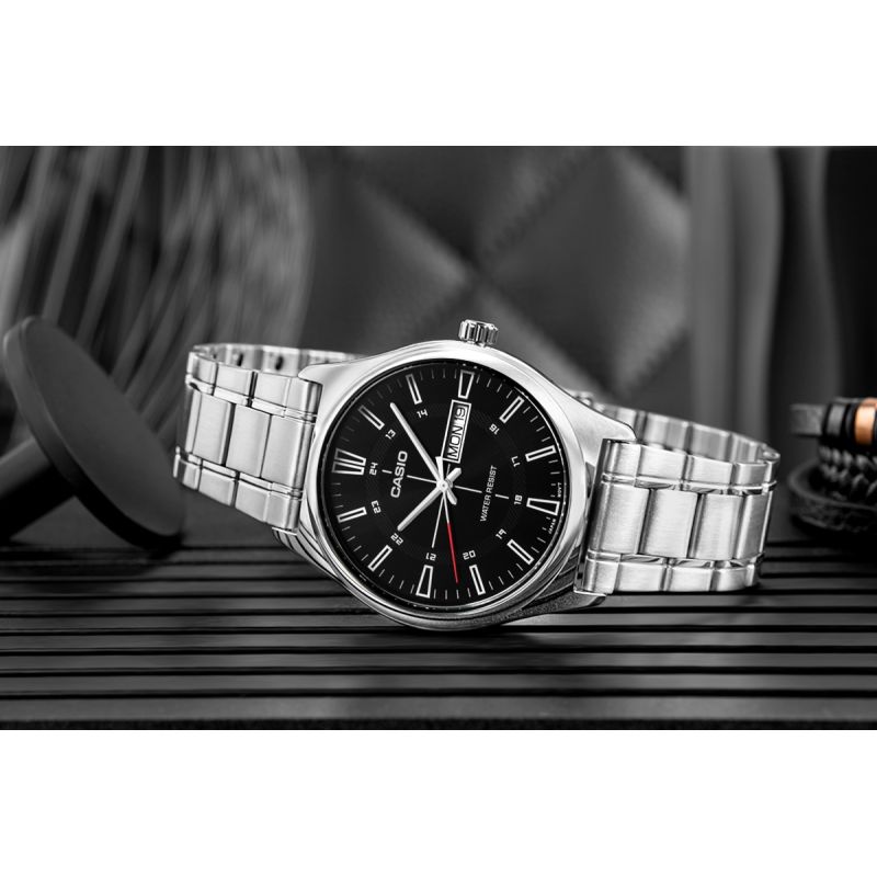 Męski model z kolekcji CASIO wyposażony w klasyczną 38-milimetrową kopertę ze stali nierdzewnej, czytelną tarczę z wyrazistymi indeksami godzinowymi oraz dodatkową skalą 24-godzinną, która ułatwia orientację w czasie. Funkcjonalny datownik umieszczony przy godzinie trzeciej umożliwia szybki podgląd aktualnego dnia tygodnia i dnia miesiąca, awodoodporność na poziomie WR gwarantuje bezpieczeństwo użytkowania w codziennych sytuacjach. Dziękibransolecie ze stali szlachetnej o matowym wykończeniu zegarek zyskuje elegancki charakter, który pasuje zarówno do garnituru, jak i do luźniejszego, miejskiego stylu. Mechanizm kwarcowy zapewnia precyzję i niezawodność, z której słynie marka Casio.