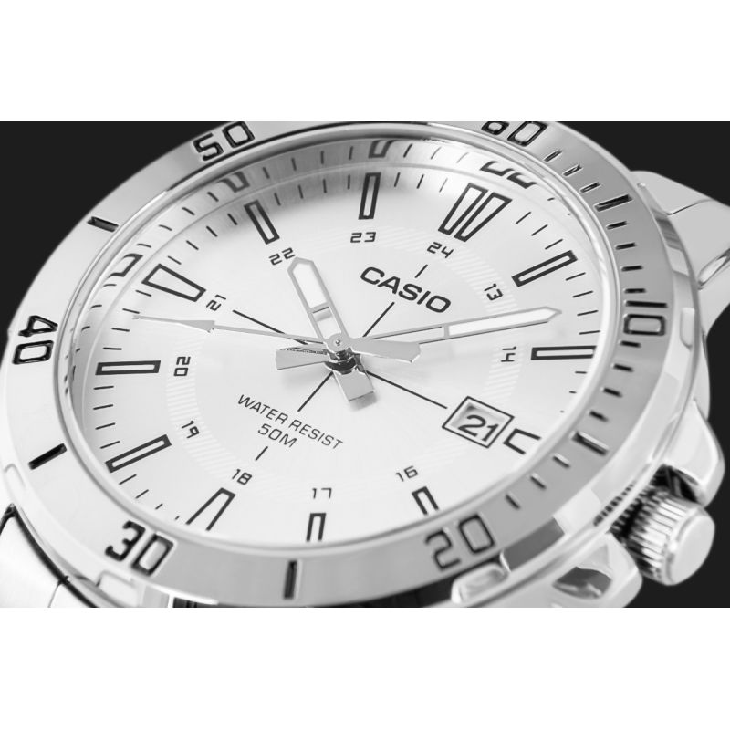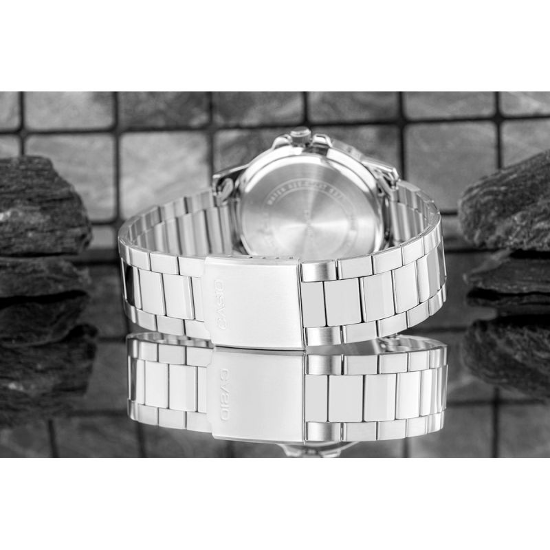 Klasyczny męski model z kolekcji CASIO wyposażony w solidną, 44-milimetrową kopertę ze stali nierdzewnej, czytelną tarczę z wyrazistymi indeksami godzinowymi oraz dodatkową skalą 24-godzinną, która ułatwia orientację w czasie. Funkcjonalny datownik umieszczony przy godzinie trzeciej umożliwia szybki podgląd aktualnego dnia miesiąca, a wodoodporność na poziomie 50M gwarantuje bezpieczeństwo użytkowania w codziennych sytuacjach – od deszczu po kontakt z wodą podczas aktywności.Dzięki bransolecie z matowo-polerowanej stali szlachetnej, zegarek zyskuje elegancki charakter, który pasuje zarówno do garnituru, jak i do luźniejszego, miejskiego stylu. Mechanizm kwarcowy zapewnia precyzję i niezawodność, z której słynie marka Casio.