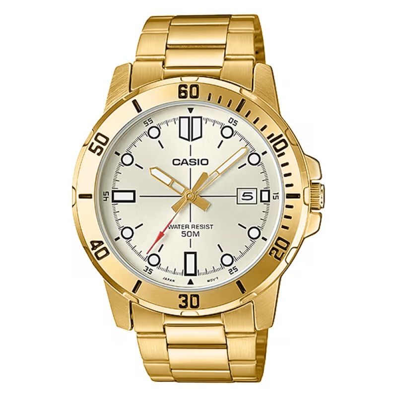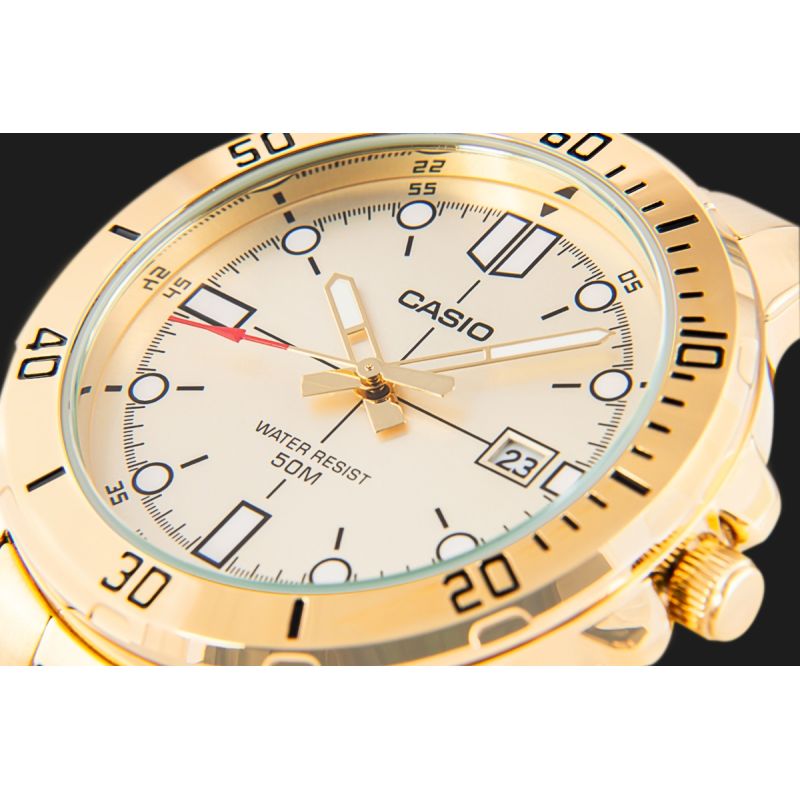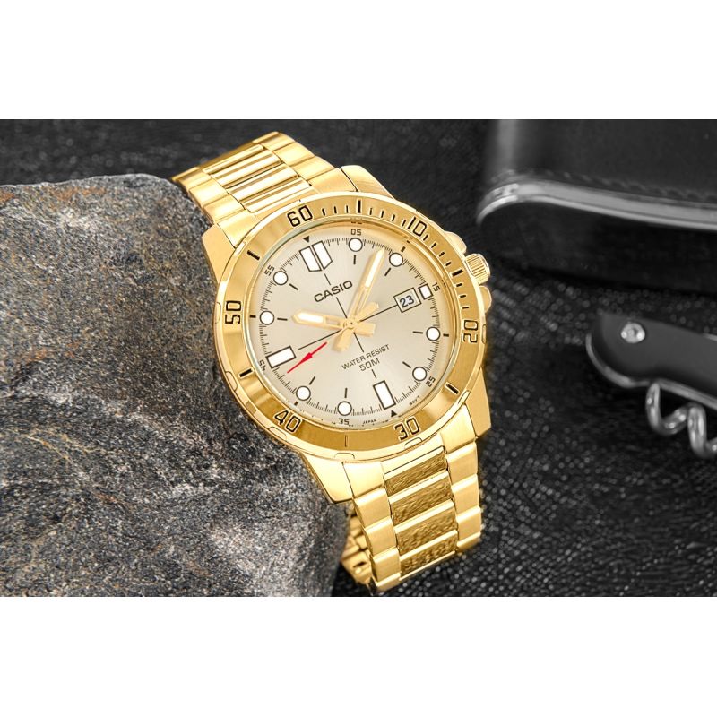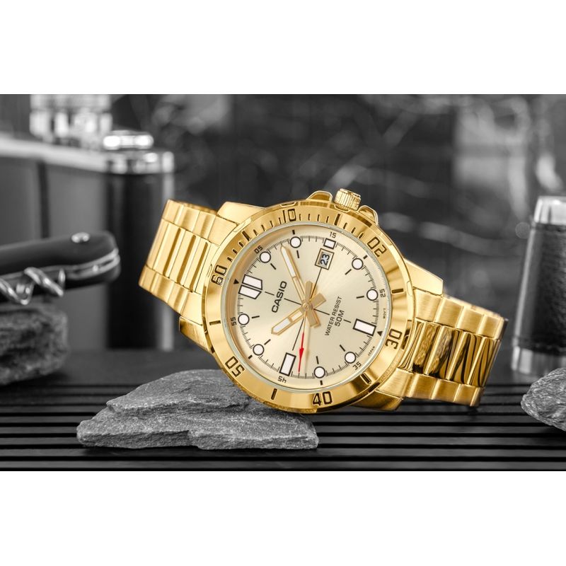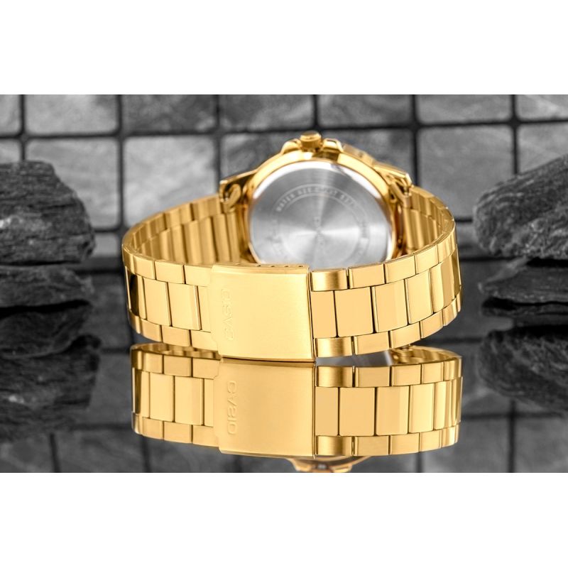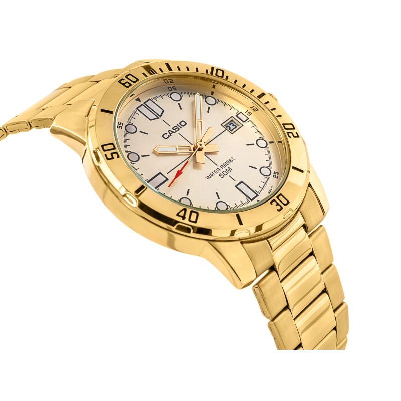 Zdecydowany i elegancki model CASIO przyciągający uwagę już od pierwszego spojrzenia. Koperta o średnicy 44 mm, w całości utrzymana w efektownym odcieniu złota, skrywa jasną, subtelnie połyskującą tarczę z mocnymi indeksami i wyrazistym, czerwonym grotem sekundnika. Solidne wskazówki i kontrastowe oznaczenia godzinowe zapewniają wysoką czytelność w każdych warunkach. Datownik przy godzinie trzeciej pozwala zachować kontrolę nad czasem, a wodoodporność na poziomie 50M daje swobodę ruchu – niezależnie od pogody czy sytuacji. Uzupełnieniem jest złota bransoleta z potrójnym zapięciem – wygodna, trwała i doskonale dopasowana do dynamicznego trybu życia. Precyzyjny mechanizm kwarcowy gwarantuje punktualność, jakiej potrzebujesz na co dzień.