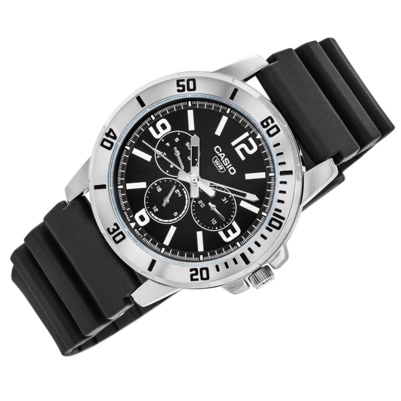 Casio MTP-VD300-1BUDF to klasyczny męski zegarek, który łączy w sobie elegancję i funkcjonalność w najlepszym wydaniu. Wyposażony w czytelną, czarną tarczę z trzema subtelnie rozmieszczonymi subtarczami – datownikiem, wskazaniem dnia tygodnia i 24-godzinnym czasem – gwarantuje pełną kontrolę nad codziennym rytmem dnia. Stalowa koperta oraz solidna bransoleta zapewniają trwałość i ponadczasowy wygląd, który pasuje zarówno do garnituru, jak i casualowych stylizacji. Mineralne szkiełko chroni zegarek przed zarysowaniami, a precyzyjny mechanizm kwarcowy dba o niezawodność w każdej sytuacji. To propozycja dla mężczyzny, który ceni prostotę, styl i praktyczne rozwiązania w jednym akcesorium.