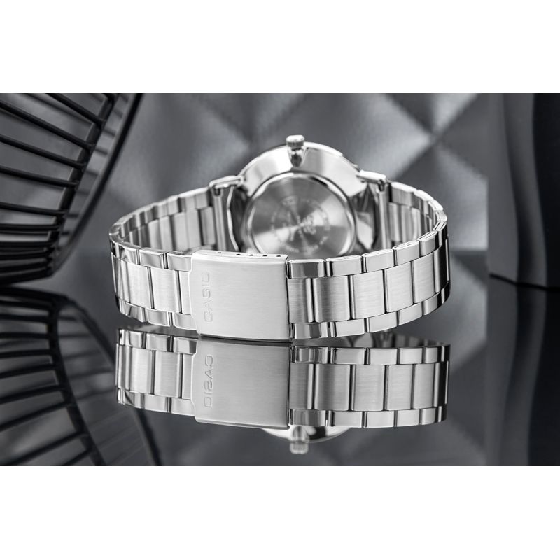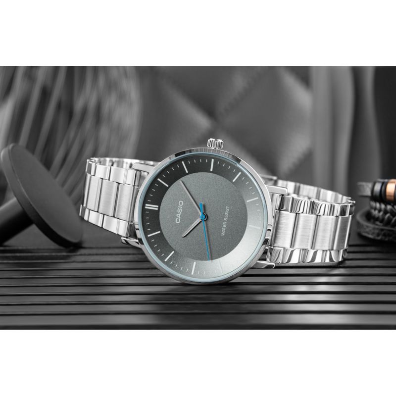 MTP-VT04D to ukłon w stronę czystego designu – bez rozpraszaczy, bez komplikacji, bez hałasu. Tylko Ty i czas – odczytywany z idealnie zbalansowanej tarczy, na której każda kreska ma sens, a każda sekunda płynie w rytmie prostoty. Brak cyfr? To nie brak – to wybór. Brak datownika? Również. Wszystko, co zbędne, zniknęło, by zostawić to, co najważniejsze. Czytelność. Równowagę. Spokój. Powierzchnia tarczy o matowej teksturze dodatkowo nadaje całości nowoczesnego, minimalistycznego charakteru. Ten zegarek dopasowuje się do Ciebie, nie odwrotnie. Idealnie odnajdzie się czy to pod mankietem marynarki, czy w towarzystwie ulubionego T-shirtu. Zegarek jest cieńki (8,5 mm) i lekki (90g), a całość wygodna i gotowa, by być z Tobą codziennie – nie dominując, ale dopełniając.