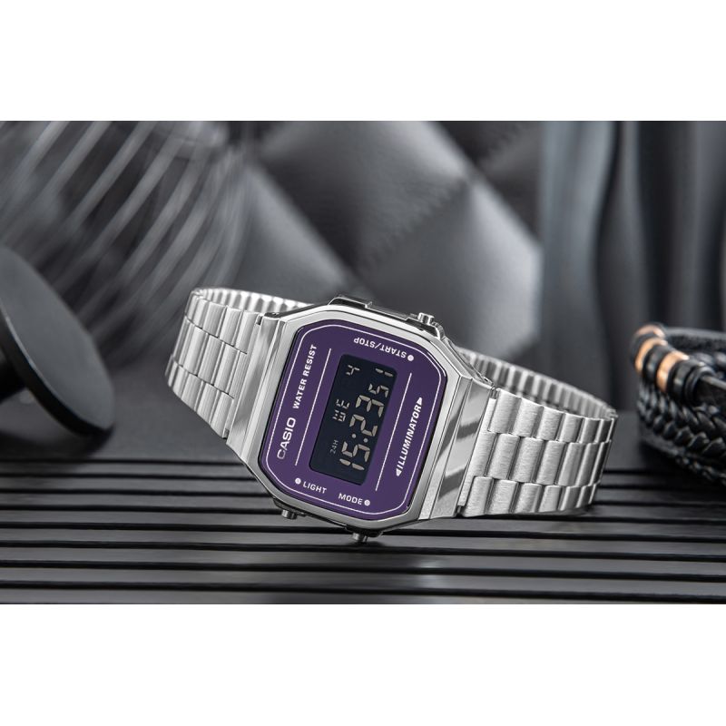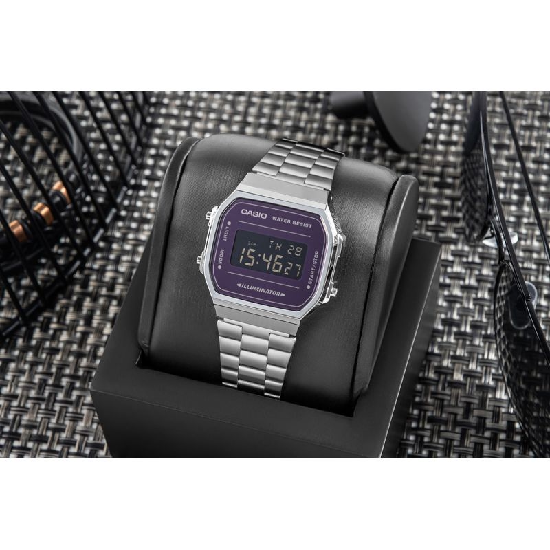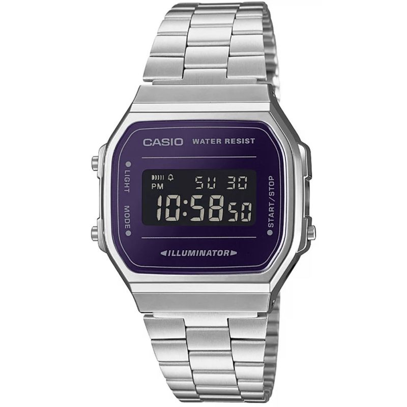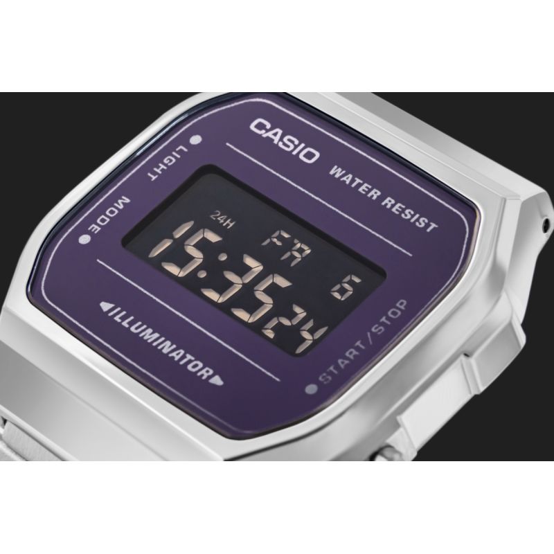 Nie potrzebujesz krzykliwych dodatków, by zwrócić na siebie uwagę. Klasyczna sylwetka Casio spotyka się tu z nowoczesnym wykończeniem – lustrzana tarcza w metalicznym fiolecie przyciąga wzrok, odbijając światło z charakterystycznym połyskiem, który robi wrażenie w każdej sytuacji – od biura po wieczorne wyjście. Model posiada standardowe wskazanie czasu (cyfrowe): godzina, minuta, sekunda, oznaczenie pory dnia (PM), data, dzień tygodnia. A gdy przychodzi moment działania – ma wszystko, czego trzeba. Stoper 1/100 sekundy, funkcja międzyczasów, codzienny alarm i sygnał godzinowy – praktyczne narzędzia w zgrabnym wydaniu. Wieczorem, gdy światło przygasa, wystarczy jedno naciśnięcie –elektroluminescencyjne podświetlenie w odcieniu niebieskozielonym rozjaśni tarczę i nada jej niepowtarzalnego klimatu. Model posiada również odporność na zachlapania – bo życie nie pyta, czy masz parasol.