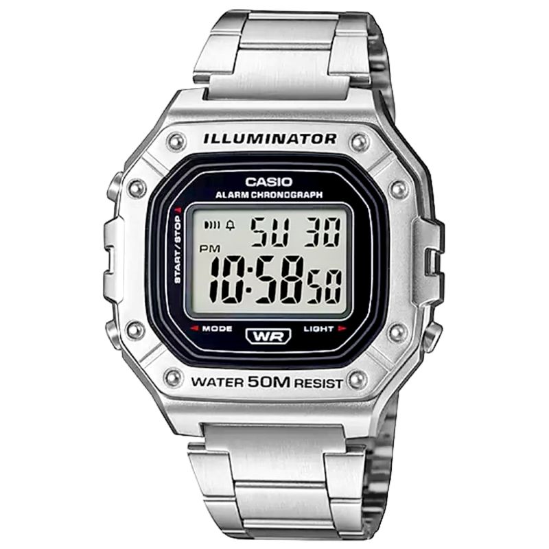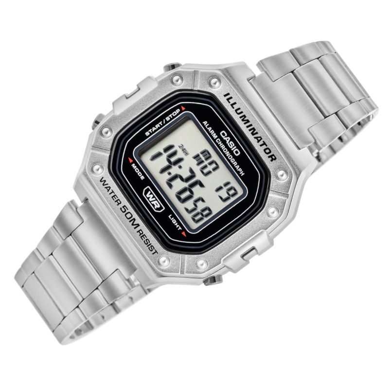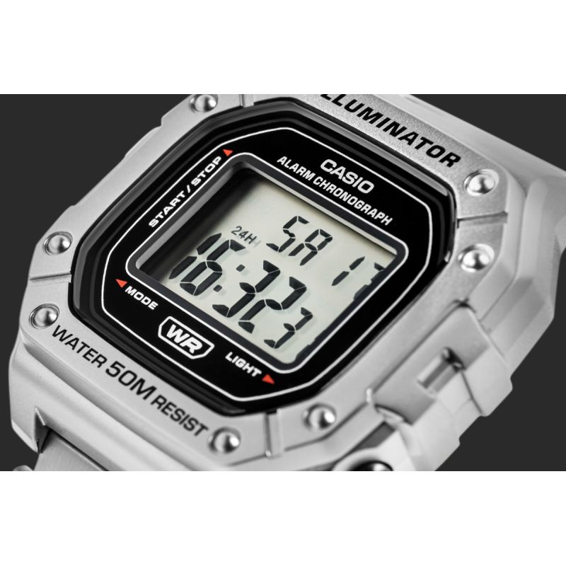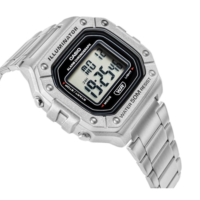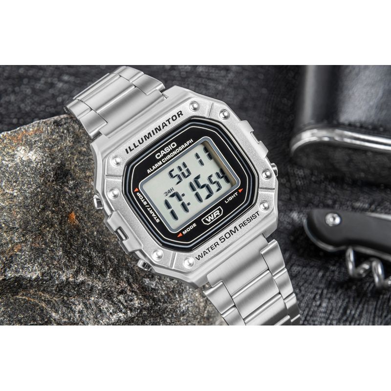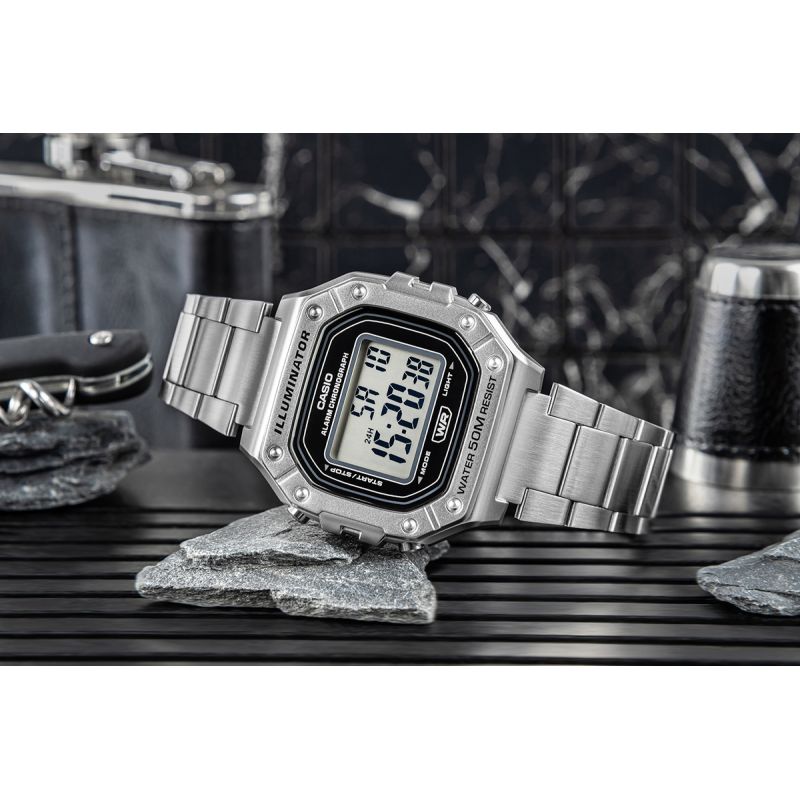 Casio W-218HD-1AVDF to esencja klasycznego stylu Casio w nowoczesnym, sportowym wydaniu: wyrazisty, prostokątny wyświetlacz LCD w solidnej kopercie, czytelny na pierwszy rzut oka, z subtelnymi akcentami, które dodają mu świeżości i uniwersalności. Zegarek został stworzony do codziennego tempa: wodoszczelność 50 m, podświetlenie LED dla pewnego odczytu po zmroku, 7-letnia bateria dla długiej niezawodności, a także praktyczny zestaw funkcji – stoper 1/100 s (do 60 min), alarm dzienny i sygnał pełnej godziny, automatyczny kalendarz oraz format 12/24 h. Lekki i wygodny, zszkiełkiem z tworzywa (Resin Glass) i wytrzymałą bransoletą, świetnie sprawdzi się zarówno na treningu, jak i w codziennych stylizacjach. Jeśli szukasz bezkompromisowej prostoty połączonej z legendarną trwałością Casio, będzie strzałem w dziesiątkę.