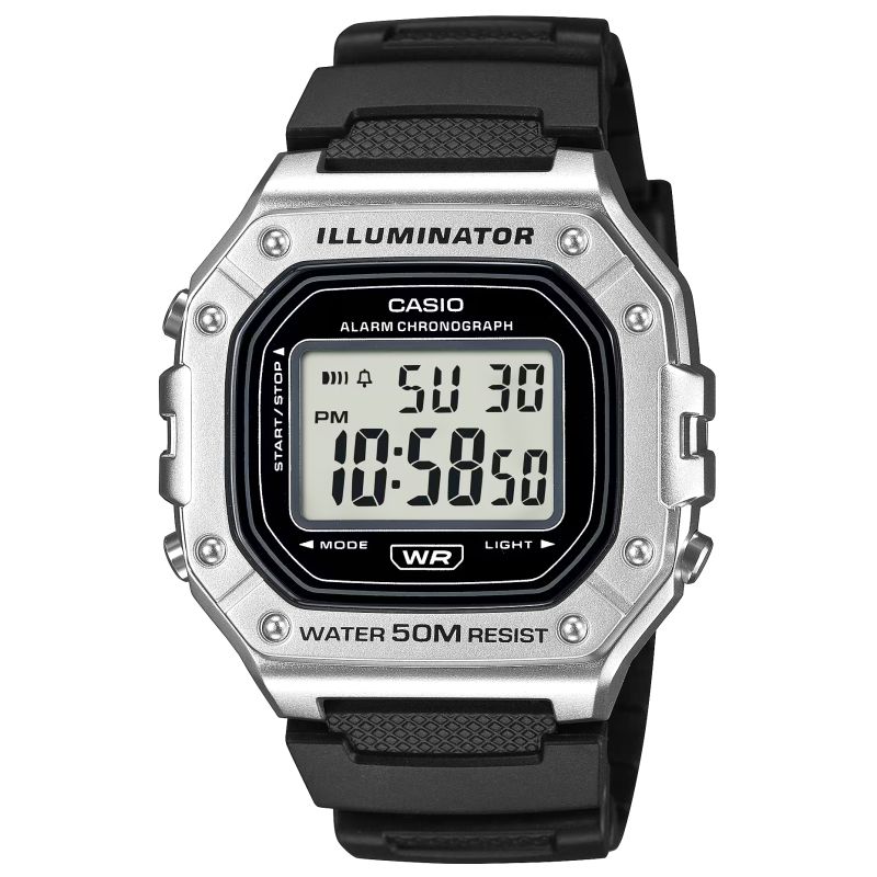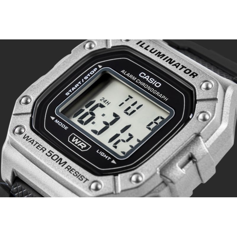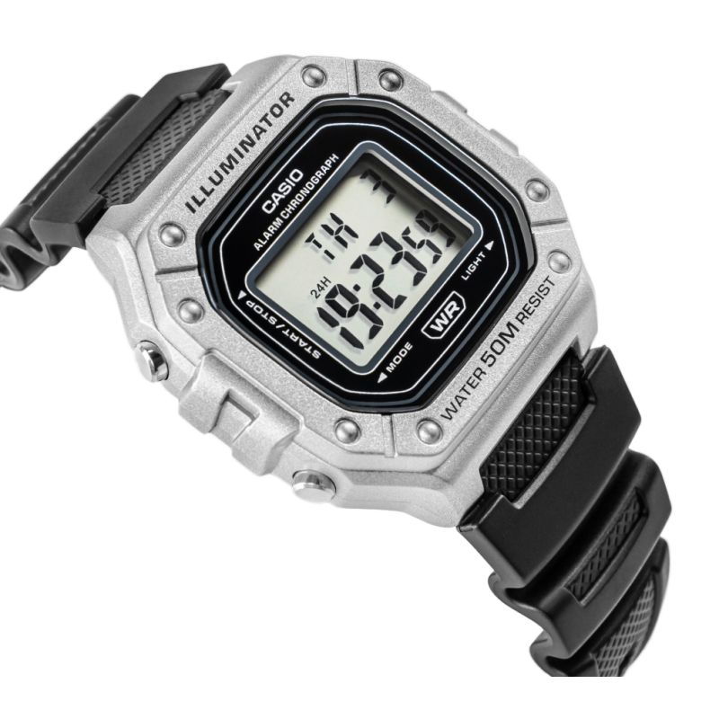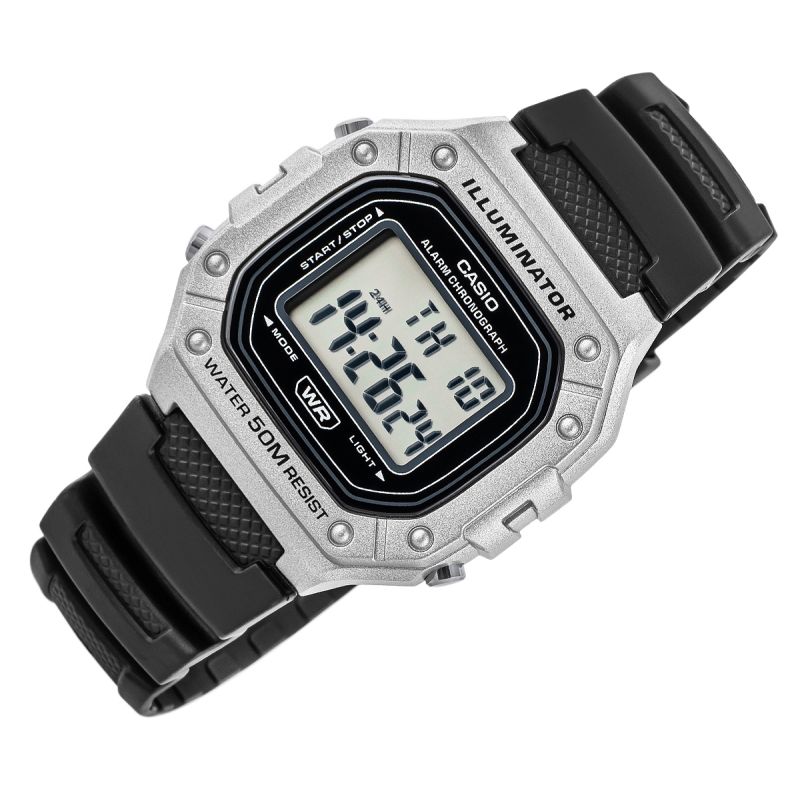 Casio W-218HM-7AVDF to esencja klasycznego stylu Casio w nowoczesnym, sportowym wydaniu: wyrazisty, prostokątny wyświetlacz LCD w solidnej kopercie, czytelny na pierwszy rzut oka, z subtelnymi akcentami, które dodają mu świeżości i uniwersalności. Zegarek został stworzony do codziennego tempa: wodoszczelność 50 m, podświetlenie LED dla pewnego odczytu po zmroku, 7-letnia bateria dla długiej niezawodności, a także praktyczny zestaw funkcji – stoper 1/100 s (do 60 min), alarm dzienny i sygnał pełnej godziny, automatyczny kalendarz oraz format 12/24 h. Lekki i wygodny, zszkiełkiem z tworzywa (Resin Glass) i wytrzymałym paskiem z żywicy, świetnie sprawdzi się zarówno na treningu, jak i w codziennych stylizacjach. Jeśli szukasz bezkompromisowej prostoty połączonej z legendarną trwałością Casio, W-218HM-7AVDF będzie strzałem w dziesiątkę.