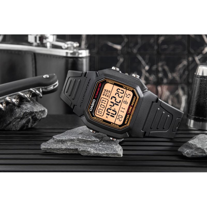 Zegarek Męski Casio W-800H to niezawodność w czytelniej formie - nowoczesny zegarek cyfrowy z dużym wyświetlaczem, który umożliwia szybki i łatwy odczyt godziny. Wyposażony w wodoszczelność do 100 metrów, baterię o żywotności 10 lat, podświetlenie LED oraz inne funkcje. Zegarek oferuje wszystkie najważniejsze informacje - godzina, data i dzień tygodnia - w dużej czytelnej formie. Dzięki funkcjom takim jak stoper 1/100 sekundy, podwójny czas i alarm z drzemką, świetnie sprawdza się zarówno podczas treningów, jak i w podróży. Wytrzymałe podświetlenie LED z efektem poświaty zapewnia dobrą widoczność nawet po zmroku. Solidna konstrukcja zapewnia trwałość w miejskiej dżungli i podczas outdoorowych przygód.