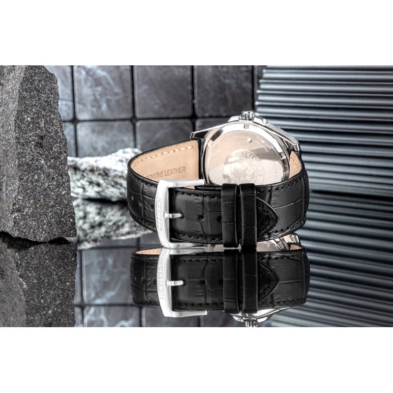 Czarna tarcza nadaje zegarkowi subtelnego, eleganckiego charakteru, doskonale komponując się z minimalistycznym stylem. Smukłe, czytelne indeksy oraz klasyczne wskazówki zapewniają przejrzystość i komfort odczytu godziny, podkreślając jednocześnie wyrafinowany wygląd modelu. Datownik umieszczony na godzinie trzeciej stanowi praktyczne uzupełnienie funkcjonalności, umożliwiając szybki dostęp do aktualnej daty.