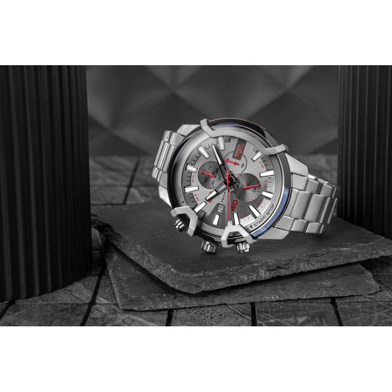 Srebrzystoszary odcień z delikatnym, szczotkowanym wykończeniem tworzy bazę, która wydobywa moc detali. Wyraziste, czerwone akcenty na wskazówkach i subtarczach wnoszą dynamikę i energię, jakby zegarek był gotowy na każdą akcję. Wysokie indeksy i elementy wystające z powierzchni tarczy nadają jej trójwymiarowego charakteru, podkreślając solidność i głębię projektu. Dzięki powłoce luminescencyjnej na wskazówkach i indeksach odczyt czasu jest możliwy nawet w słabym świetle, co zwiększa praktyczność modelu. Maszynowy napis DIESEL wygrawerowany z boku koperty to detal, który mówi wiele o charakterze tego modelu – surowy, bezkompromisowy, gotowy sprostać oczekiwaniom najbardziej wymagających mężczyzn.