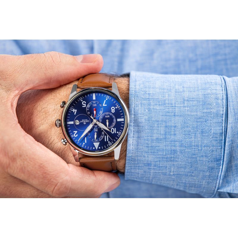 Zegarek Męski Giewont GW5630-A6 to wyjątkowe połączenie lotniczej stylistyki, funkcjonalności oraz zdecydowanego, męskiego charakteru — model stworzony dla osób ceniących wyrazisty design i pełną czytelność w każdych warunkach. Jego tarcza przyciąga uwagę dużymi, kontrastowymi cyframi arabskimi oraz charakterystycznym trójkątnym znacznikiem na godzinie 12, które nadają zegarkowi autentyczny, pilotowy charakter. Trzy precyzyjne subtarcze oferują funkcje chronografu, takie jak pomiar minut, sekund oraz 1/10 sekundy, dodając mu sportowego temperamentu i technicznej głębi. Wytrzymałe szkiełko szafirowe skutecznie chroni tarczę przed zarysowaniami, gwarantując zachowanie idealnego wyglądu przez długi czas, nawet przy intensywnym użytkowaniu. Koperta o eleganckim wykończeniu doskonale komponuje się z miękkim, skórzanym paskiem, który zapewnia komfort i świetne dopasowanie do nadgarstka. Funkcjonalność modelu podkreśla również praktyczny datownik na godzinie 3, zwiększający jego codzienną użyteczność. Zegarek Giewont GW5630-A6 to model dla mężczyzny pewnego siebie, świadomego stylu i ceniącego detale — zegarek, który wyróżnia się z daleka, a z bliska zachwyca głębią i ponadczasową elegancją.