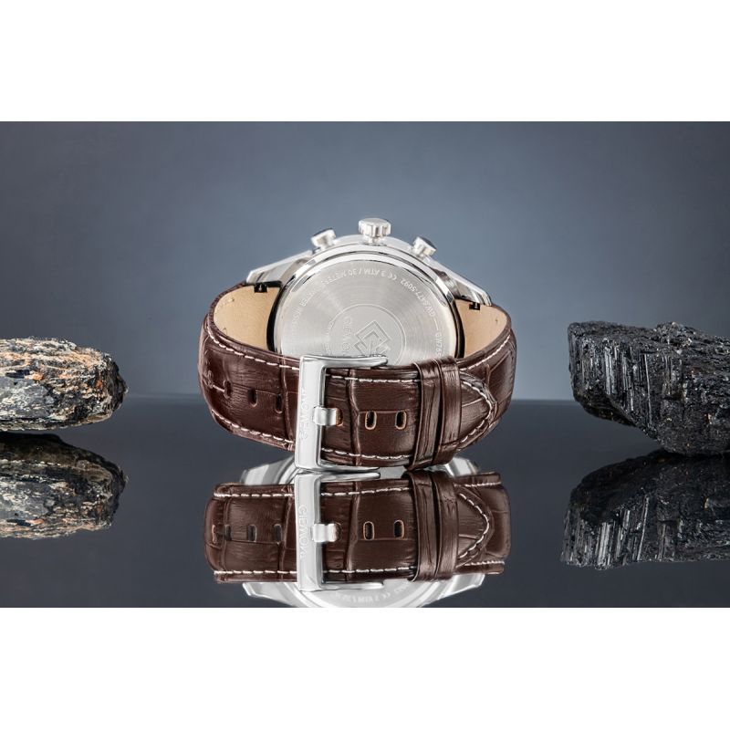 Brązowy, skórzany pasek o eleganckiej fakturze zapewnia komfort noszenia i świetnie komponuje się z klasyczną kopertą w srebrnym kolorze. To zegarek, który podkreśla charakter, pewność siebie i dbałość o detale.