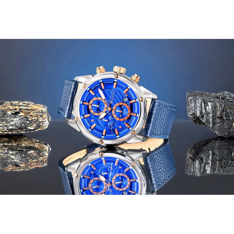 Wyrazista, niebieska tarcza z dynamiczną strukturą nadaje zegarkowi nowoczesnego, technicznego wyglądu. Zastosowane chronografy podkreślają sportowe DNA modelu, a praktyczny datownik zwiększa jego funkcjonalność, czyniąc go idealnym towarzyszem codziennego użytkowania. Całość chroni szafirowe szkło, odporne na zarysowania i gwarantujące trwałość na lata.