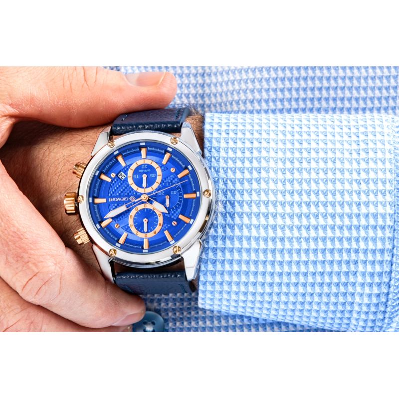 Zegarek męskiGiewont GW8810-A2to model zaprojektowany dla mężczyzny, który oczekuje wyrazistego charakteru, niezawodnej konstrukcji i funkcjonalności gotowej sprostać rytmowi codziennych zadań. Zastosowane chronografy podkreślają sportowe DNA modelu, a praktyczny datownik zwiększa jego funkcjonalność, czyniąc go idealnym towarzyszem codziennego użytkowania. Zegarek prezentuje dynamiczny, czytelny design, który podkreśla nowoczesny oraz sportowo-klasyczny profil zegarka. Każdy element rozmieszczono z myślą o intuicyjnym odczycie i estetycznej harmonii, dzięki czemu całość sprawia wrażenie doskonale zaprojektowanego narzędzia czasu.
