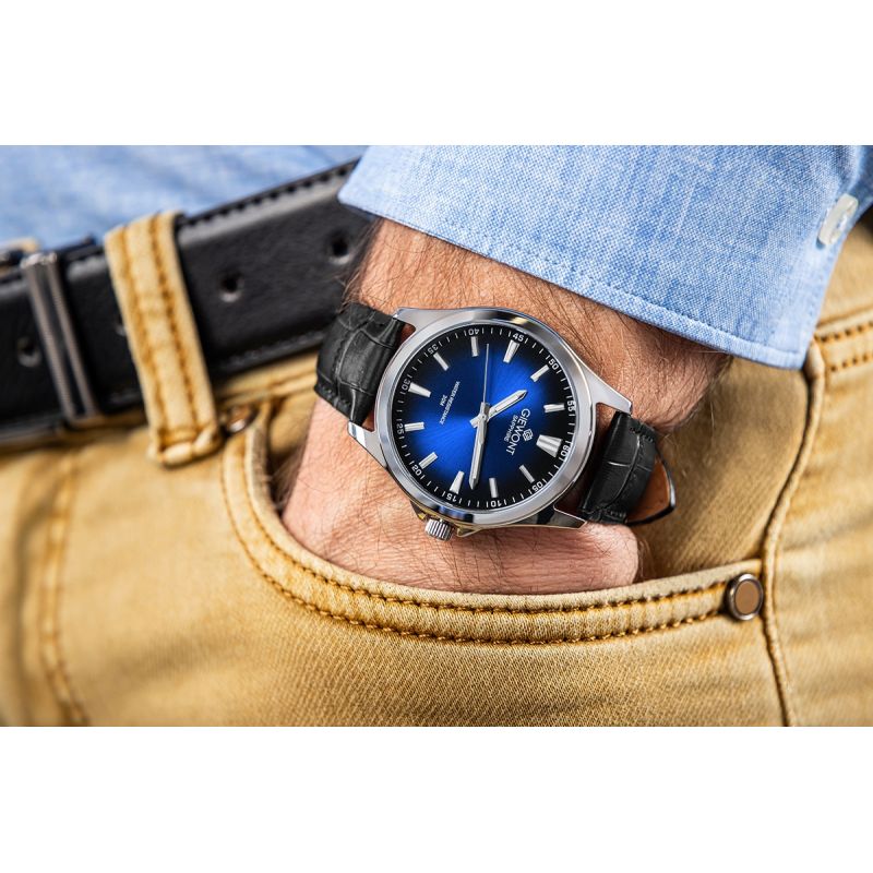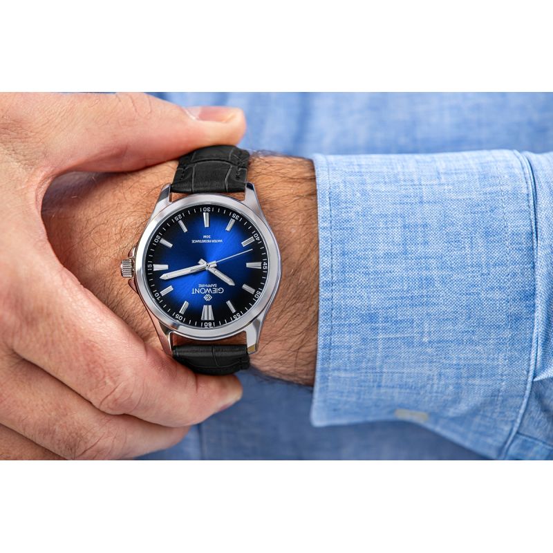 GIEWONT Elegance Sapphire to zegarek stworzony dla mężczyzn, którzy cenią sobie nienaganny styl, dobrą jakość wykonania i detale świadczące o dobrym guście. Jego głęboka, granatowa tarcza o subtelnym, promienistym gradiencie natychmiast przyciąga wzrok i nadaje całości wyjątkowego, prestiżowego charakteru, a odporne na zarysowania szafirowe szkło gwarantuje, że czasomierz zachowa swój nienaganny wygląd przez wiele lat intensywnego użytkowania. Precyzyjne, metaliczne indeksy i smukłe wskazówki zapewniają doskonałą czytelność nawet w trudnych warunkach oświetleniowych, podkreślając jednocześnie elegancki charakter zegarka. Solidna koperta w srebrnym połysku harmonijnie współgra z miękkim, klasycznym skórzanym paskiem, który idealnie dopasowuje się do nadgarstka i sprawia, że noszenie zegarka jest czystą przyjemnością. To uniwersalny, ponadczasowy model, który doskonale sprawdzi się zarówno podczas spotkań biznesowych, formalnych uroczystości, jak i w codziennych stylizacjach, dodając pewności siebie oraz wyrafinowania. GIEWONT Elegance Sapphire to nie tylko stylowy dodatek – to symbol elegancji, dbałości o detale i świadomy wybór mężczyzny, który wie, czego oczekuje od swojego czasu i od swojego stylu.