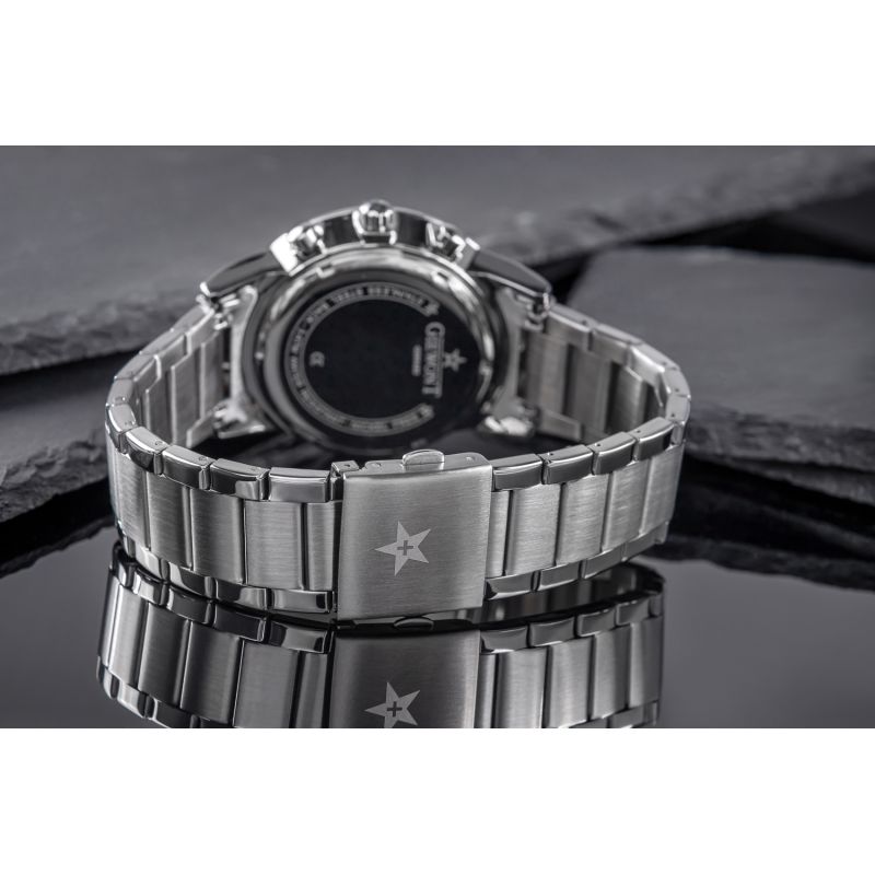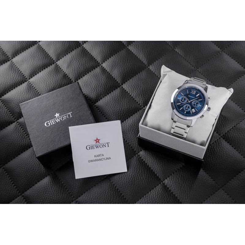 Komfortowa, stalowa bransoleta to znakomite uzupełnienie tego zegarka. Rodzaj bransolety jest gwarancją solidności i wygody podczas codziennego użytkowania. Komfort dopełnia odpowiednia jakość stali, która komfortowo dopasowuje się do męskiego nadgarstka. Zapięcie sygnowane jest logiem marki Giewont, co podnosi prestiż zegarka i zapewnia wyjątkowość na tle innych marek zegarków.