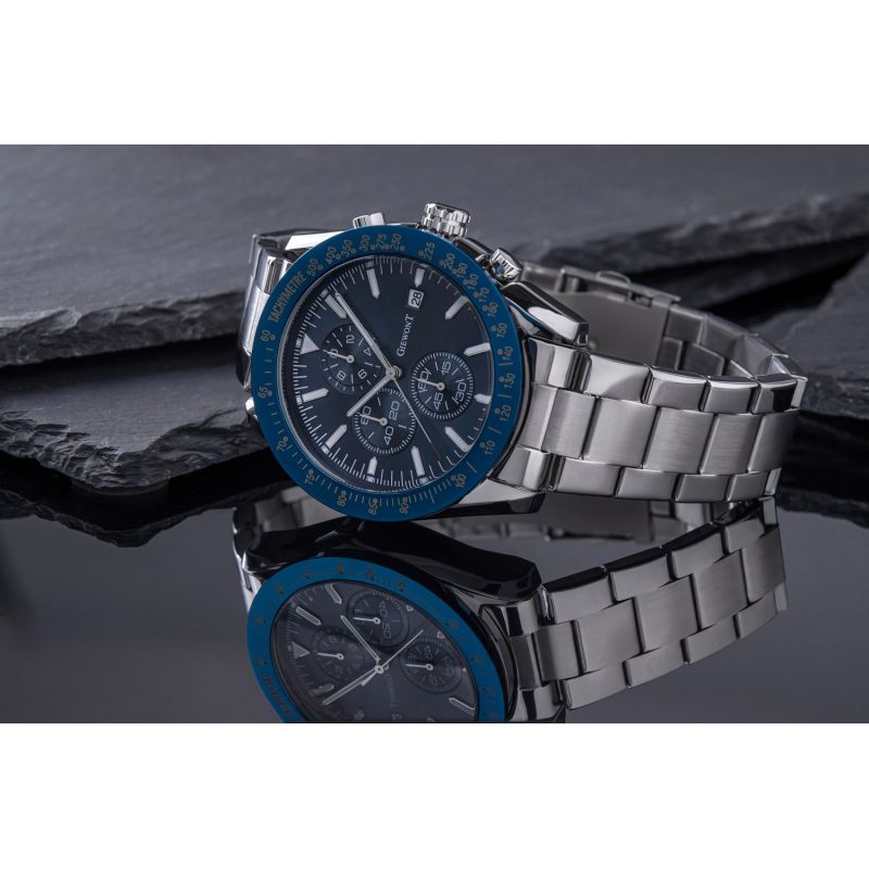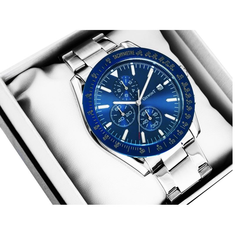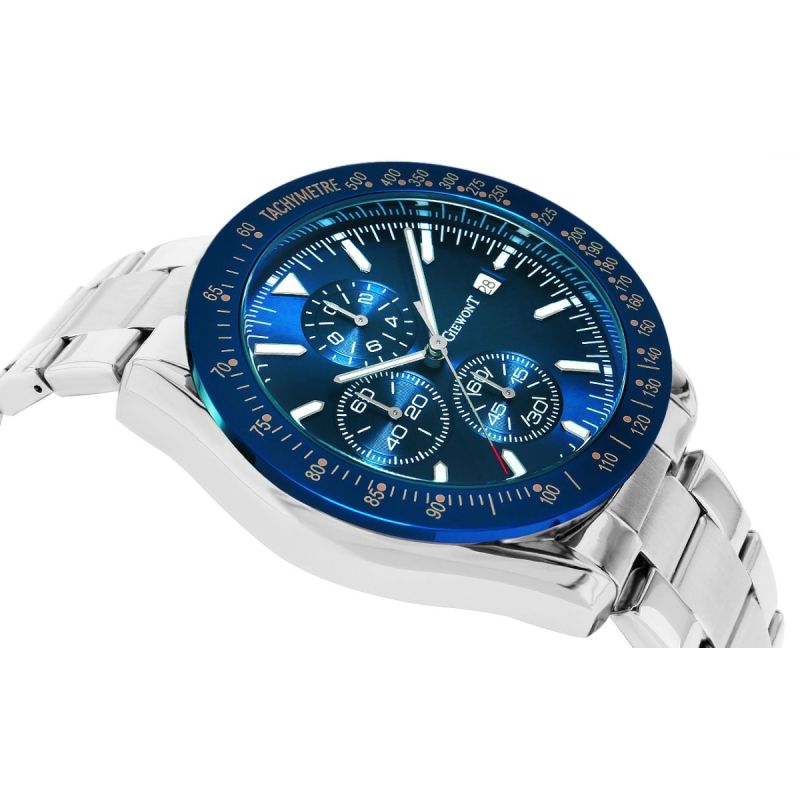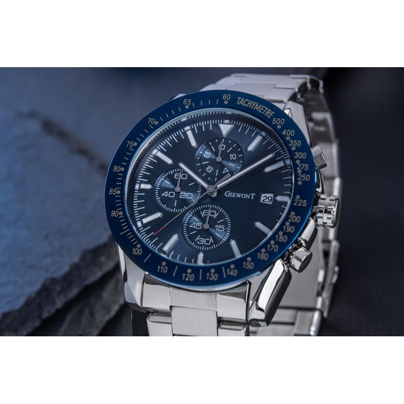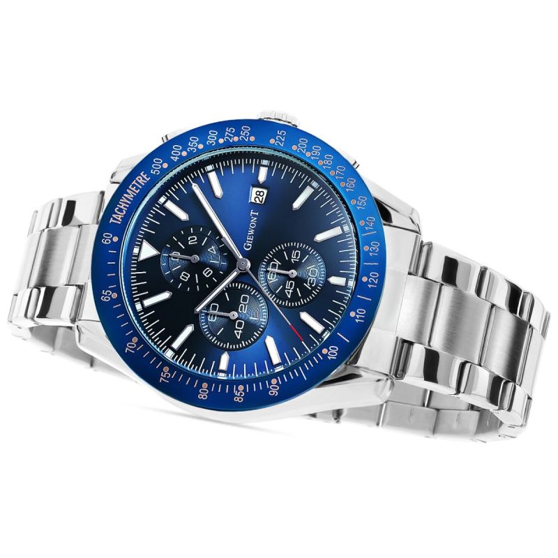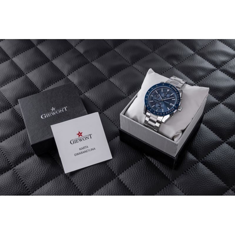 Zegarek męski Giewont GW8620-2 wyposażony jest w chronografy sekund stopera, minut stopera, trybu czasu 24-godzinnego oraz datownik dni miesiąca.