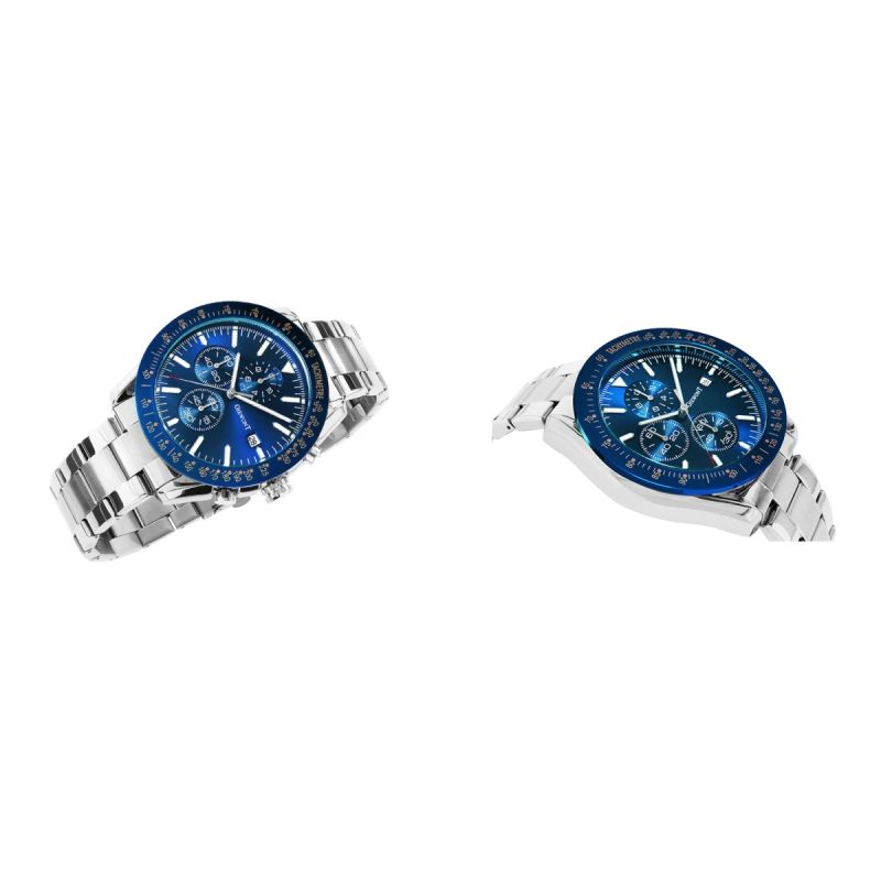 Tarcza: Analogowa z chronografami sekund stopera, minut stopera, trybu czasu 24-godzinnego oraz datownik dni miesiąca