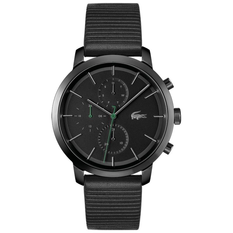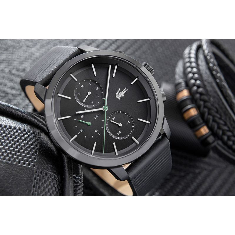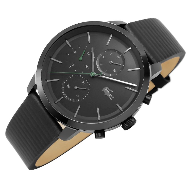 Całość utrzymana jest w głębokiej, matowej czerni, co nadaje mu wyrazistego, mocnego wyglądu. Zegarek wyróżniają subtelne zielone akcenty na wskazówkach, które dodają mu odrobinę dynamiki i nawiązują do klasycznego logo Lacoste. Wykonany z solidnych materiałów, zegarek posiada kopertę ze stali nierdzewnej, która zapewnia trwałość i elegancki wygląd. Jego czarny, teksturowany pasek ze skóry naturalnej idealnie wpisuje się w sportowy, a jednocześnie stylowy charakter tego modelu, zapewniając komfort noszenia przez cały dzień. Czarne logo Lacoste dumnie umieszczone na cyferblacie i sprzączce to znak prestiżu, który kojarzy się z ponadczasową jakością.