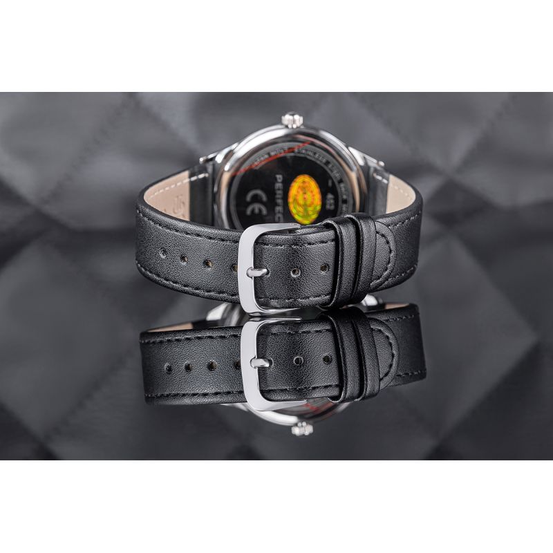 Skórzany pasek tego zegarka to kwintesencja klasy i wygody. Wykonany z najwyższej jakości materiału, komfortowo dopasowuje się do nadgarstka, oferując nie tylko trwałość, ale też elegancki wygląd. Jego miękkość zapewnia komfort noszenia na co dzień, a perfekcyjne wykończenie podkreśla charakterystyczny styl marki Perfect.