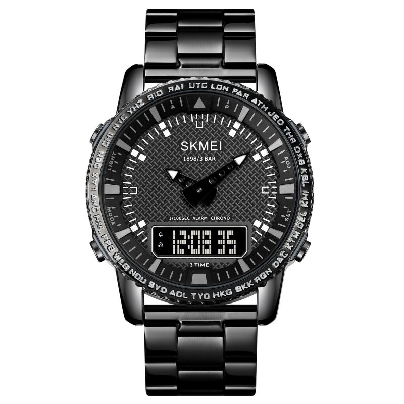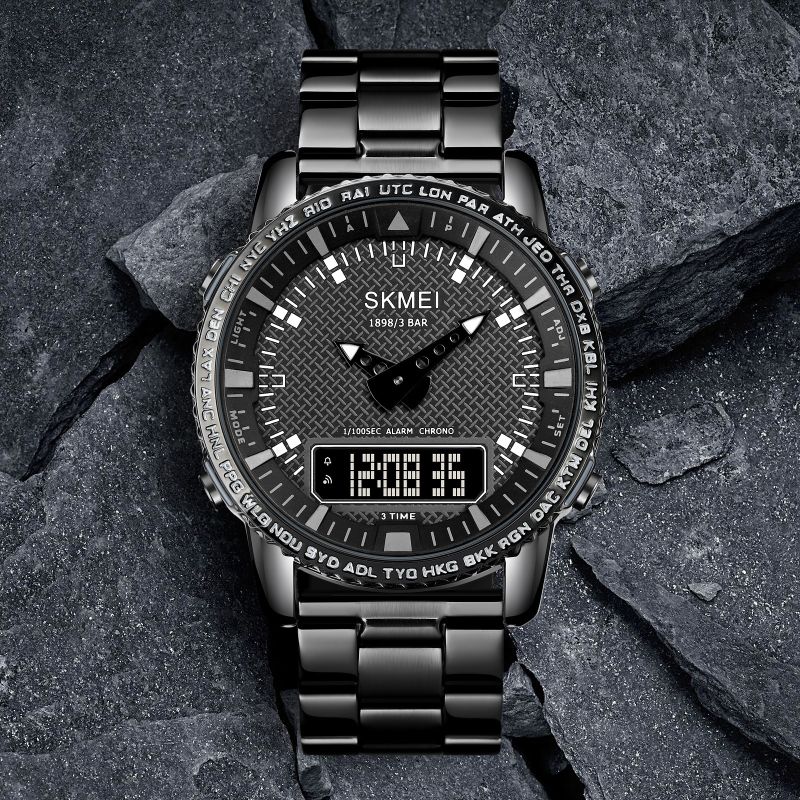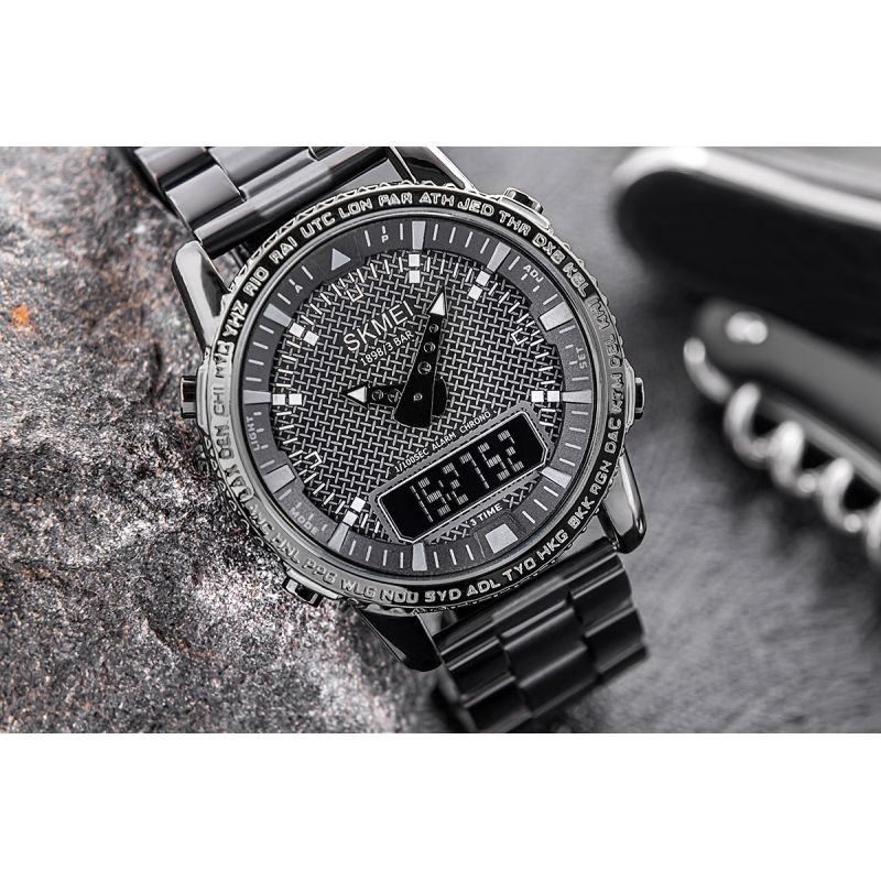 Zegarek Skmei to prawdziwe narzędzie do zarządzania męskim czasem – funkcjonalny i niezawodny, zaprojektowany z myślą o mężczyźnie, który potrzebuje czegoś więcej niż tylko wskazania godziny. Teksturowana tarcza nadaje mu głębi i surowego, męskiego charakteru, wyróżniając go spośród typowych, gładkich modeli.Obramowanie z wygrawerowanymi skrótami miast i stref czasowych, takich jak NYC, LON, czy SYD, podkreśla jego globalny styl i przydatność dla mężczyzny, który żyje i działa na poziomie międzynarodowym.