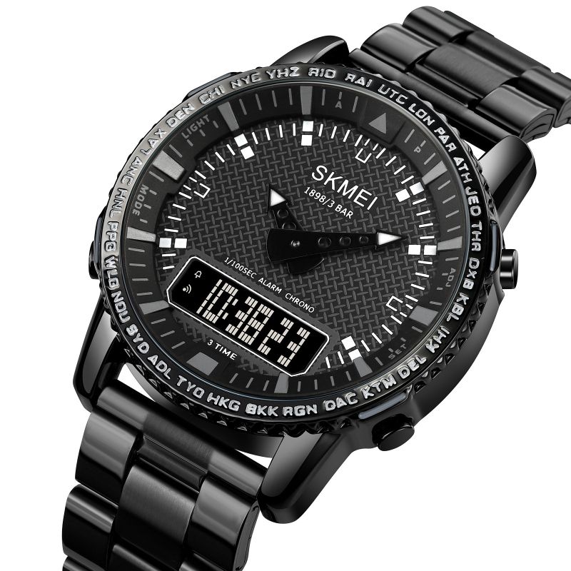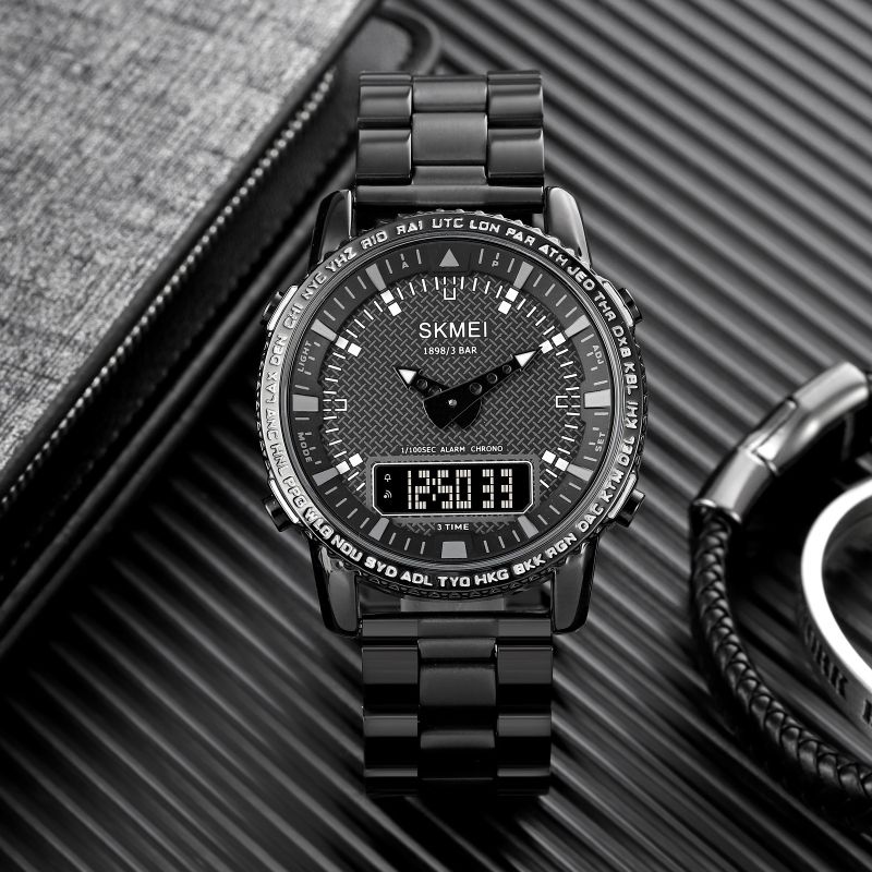 Zegarek Skmei 1898 ma wyjątkowe obramowanie tarczy, które wyróżnia się wygrawerowanymi skrótami miast i stref czasowych z całego świata. Skróty takie jak LON (Londyn), PAR (Paryż), NYC (Nowy Jork), HKG (Hongkong) czy SYD (Sydney) pozwalają użytkownikowi szybko orientować się w różnych strefach czasowych, co jest przydatne dla mężczyzny, który podróżuje lub zarządza czasem na poziomie międzynarodowym. To nie tylko funkcjonalny detal, ale także designerski akcent, który dodaje zegarkowi globalnego, profesjonalnego charakteru.