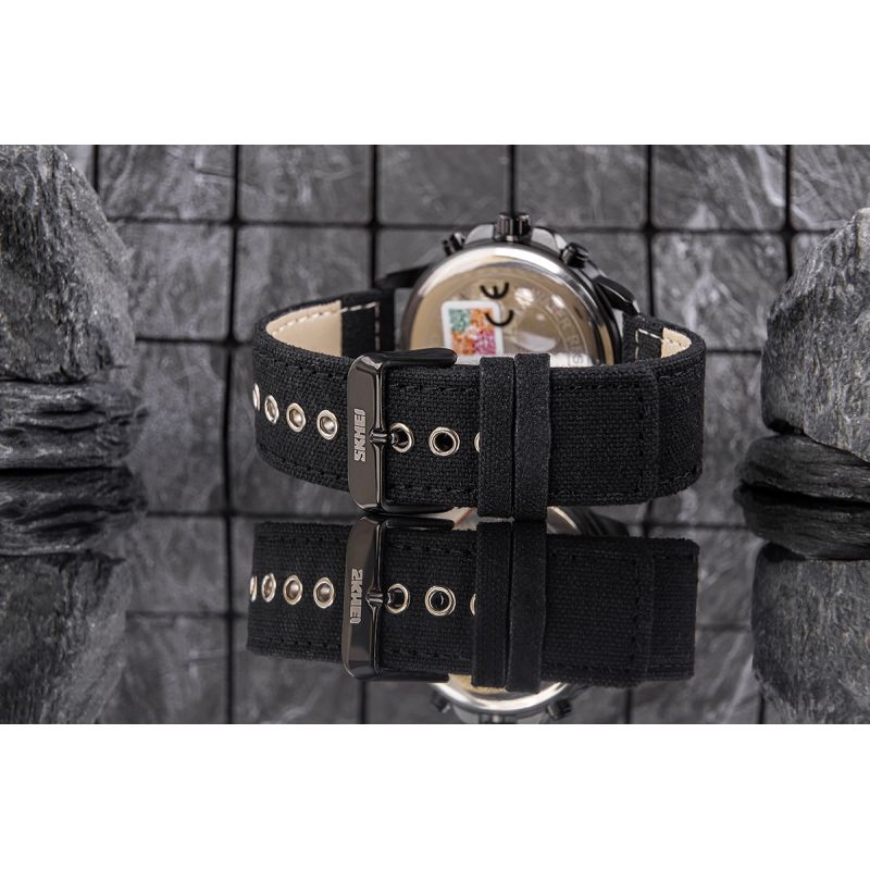 Zegarek wyposażony jest w stylowy, materiałowy pasek, który dodaje mu nowoczesnego i sportowego charakteru. Materiałowy pasek zapewnia lekkość i komfort noszenia, idealnie dopasowując się do nadgarstka i dobrze znosząc codzienne użytkowanie. Jego czarna kolorystyka harmonijnie komponuje się z ciemną tarczą i kopertą zegarka, tworząc spójną, elegancką całość. Pasek od strony wewnętrznej wykończony jest skórą naturalną zapewniając komfort noszenia. To doskonały wybór dla mężczyzn, którzy cenią sobie wygodę, wytrzymałość i nowoczesny design w klasycznej formie.