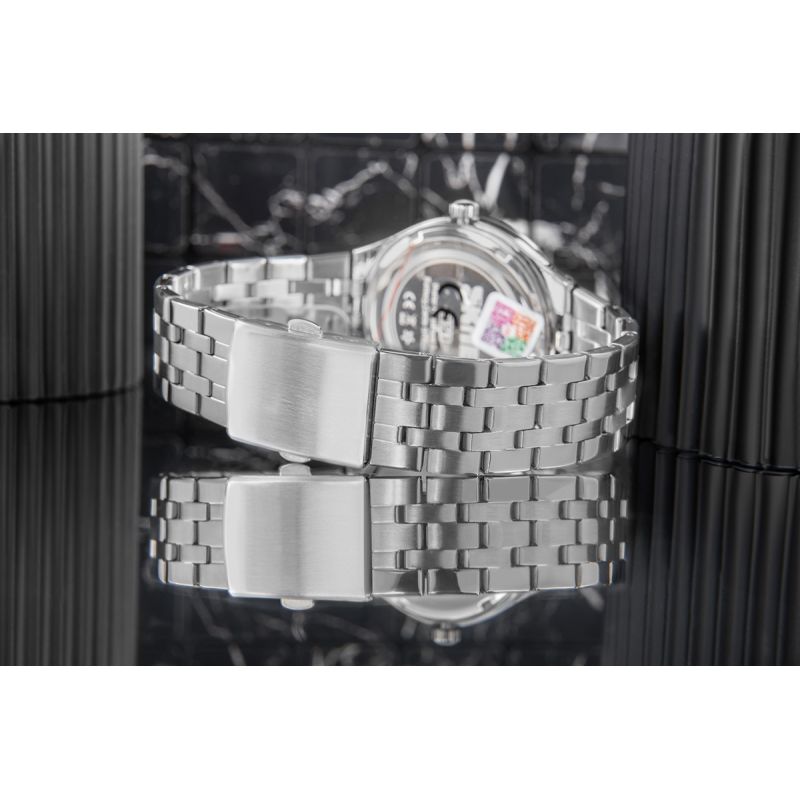 Szkiełko zastosowane w tym modelu zegarka wykonano z krzemowego szkła mineralnego, które charakteryzuje się większą twardością w porównaniu do szkła syntetycznego. Dzięki temu skutecznie chroni tarczę przed zarysowaniami, uszkodzeniami i zabrudzeniami. Co więcej, szkło mineralne cechuje się elastycznością, co sprawia, że jest mniej podatne na pęknięcia i stłuczenia. Dodatkowo zapewnia doskonałą przejrzystość oraz jasność, co znacząco ułatwia szybki i wyraźny odczyt godziny w różnych warunkach oświetleniowych.