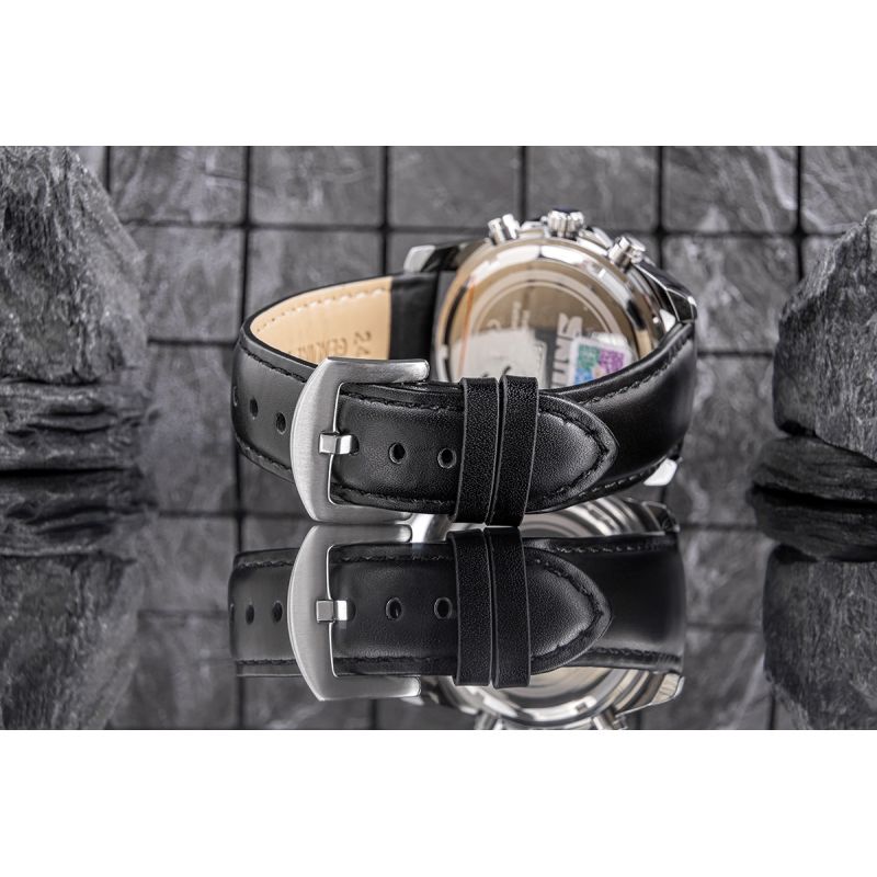 Idealny towarzysz każdego mężczyzny, który chce wyglądać dobrze, działać precyzyjnie i być zawsze gotowy na działanie. Trójwymiarowa tarcza, precyzyjne wskazówki i sportowy czerwony sekundnik tworzą niepowtarzalny design, który przyciąga wzrok. Funkcje chronografu i solidny skórzany pasek sprawiają, że to nie tylko stylowy dodatek, ale również niezawodne narzędzie do zarządzania czasem.