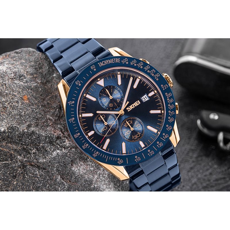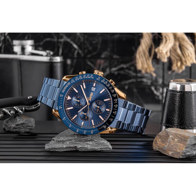 Zegarek Skmei 9253 prezentuje kolorystykę inspirowaną ekskluzywnymi zegarkami klasy premium, co nadaje mu wyjątkowego charakteru. Miedziana koperta i metaliczna granatowa bransoleta przywodzą na myśl luksus i elegancję, idealnie dopełniając granatowy kolor bezla i tarczy, co jest charakterystyczne dla najlepszych projektów światowych marek. Indeksy i wskazówki, wypełnione fluorescencyjną powłoką, nie tylko podkreślają luksusowy styl zegarka, ale również zapewniają doskonałą widoczność w każdym oświetleniu. Czerwony akcent na sekundniku dodaje mu sportowego charakteru, łącząc elegancję z dynamiką.