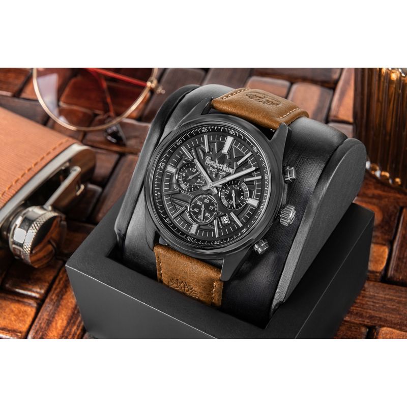 Rozbudowany układ subtarcz podkreśla techniczny charakter zegarka, a jednocześnie pozostaje czytelny i intuicyjny w obsłudze. Całość została osadzona na solidnym, skórzanym pasku w naturalnym odcieniu brązu, ozdobionym tłoczeniami logo Timberland, które podkreślają autentyczność i outdoorowe DNA marki.