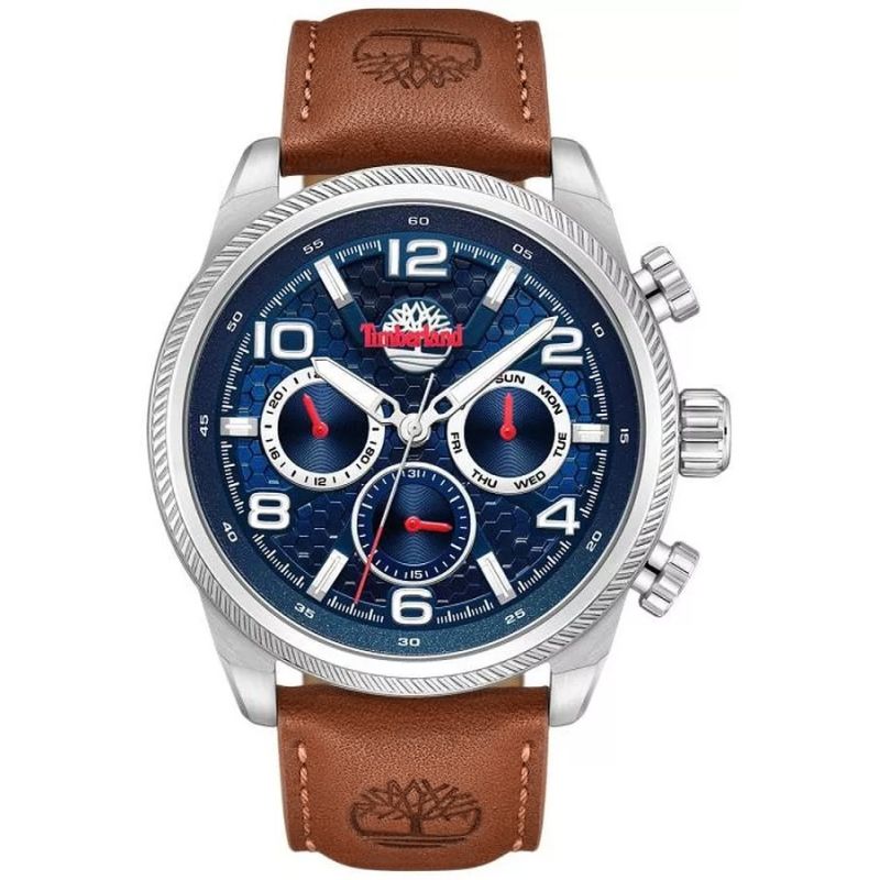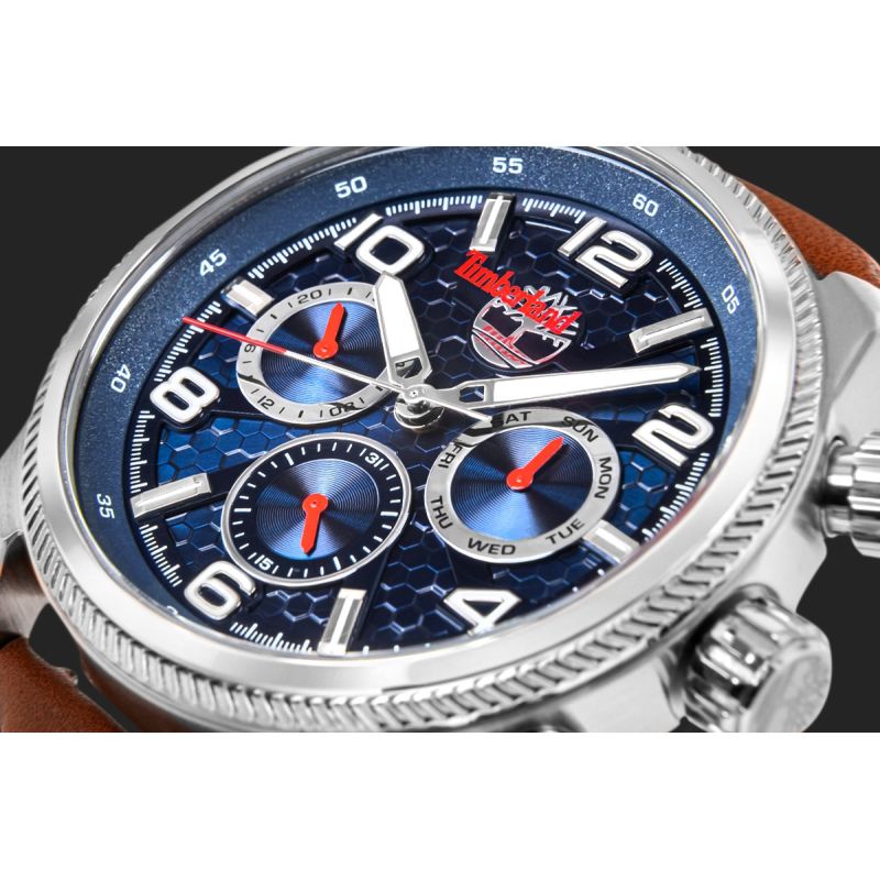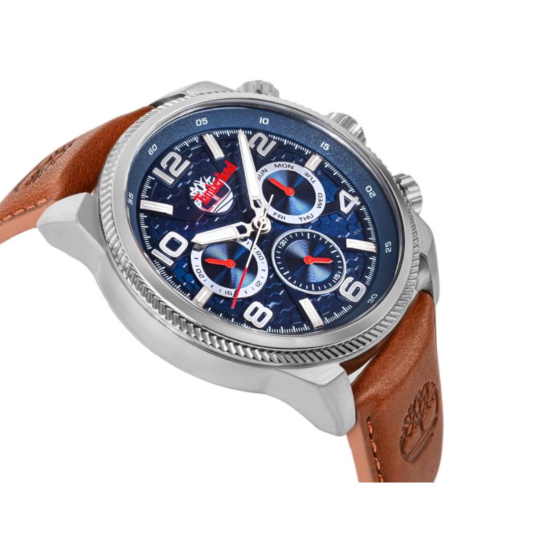Zegarek osadzono na skórzanym pasku w ciepłym, brązowym odcieniu, który doskonale komponuje się z kolorystyką tarczy. Naturalna faktura skóry oraz tłoczone logo Timberland podkreślają autentyczność i outdoorowy styl, zapewniając jednocześnie wysoki komfort noszenia.