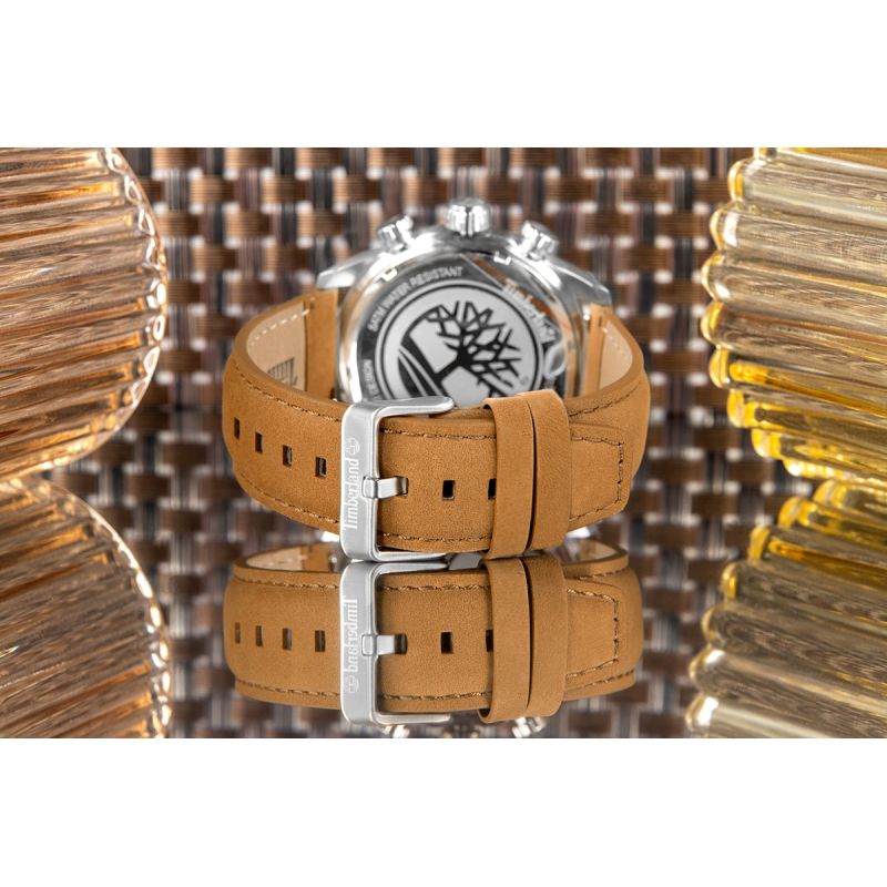 Całość uzupełnia nubukowy pasek w ciepłym, jasnobrązowym odcieniu, który wyróżnia się miękką, przyjemną w dotyku strukturą. Charakterystyczne tłoczenia logo Timberland podkreślają autentyczność i outdoorowy rodowód zegarka, a jednocześnie dodają mu unikalnego stylu.