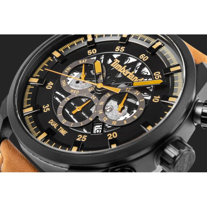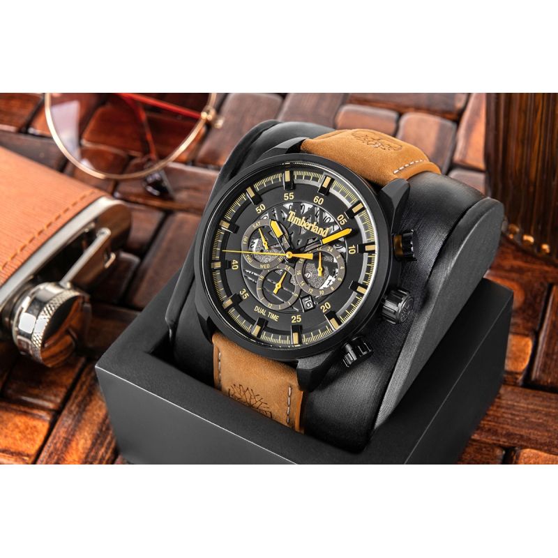 Całość zamknięta jest w solidnej, ciemnej kopercie o nowoczesnym wykończeniu, która podkreśla zdecydowany styl zegarka. Dopełnieniem jest nubukowy pasek w charakterystycznym, piaskowym odcieniu, ozdobiony tłoczeniami logo Timberland. Jego miękka, naturalna struktura zapewnia komfort noszenia, a jednocześnie świetnie wpisuje się w outdoorową estetykę.