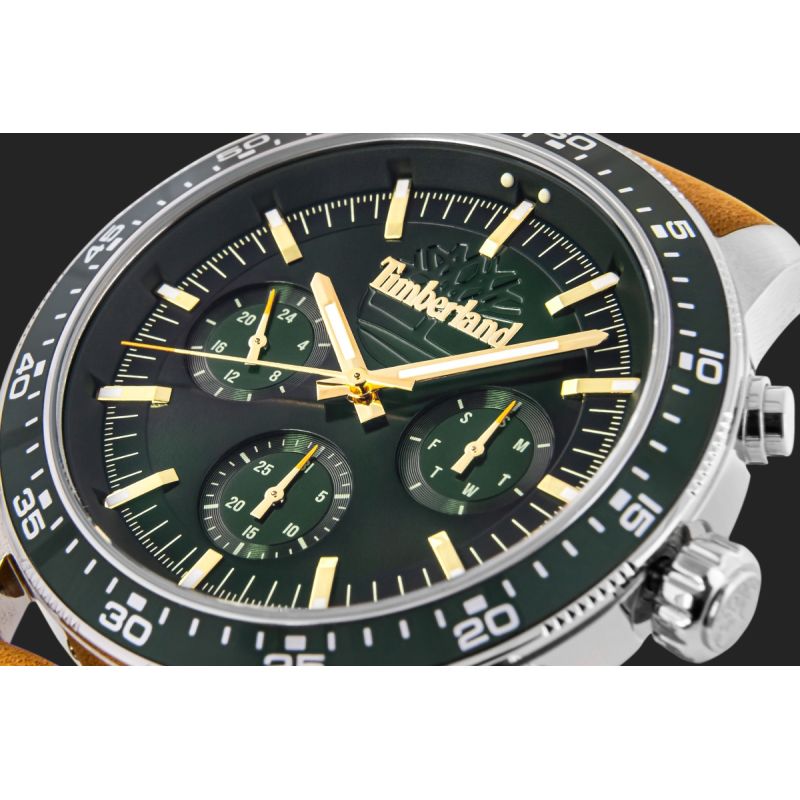 Model wyposażono w wielofunkcyjny chronograf, który nie tylko mierzy czas, ale oferuje praktyczne wsparcie w codziennym działaniu. Górna subtarcza wskazuje czas w formacie 24-godzinnym, dolna liczy sekundy w trybie stopera, a prawa prezentuje dni tygodnia (S, M, T, W, T, F, S) – wszystko pod ręką, w jednym spojrzeniu. Układ tarczy jest przejrzysty i dobrze zbalansowany, agłęboka, matowa zieleń w zestawieniu ze złotymi indeksami i wskazówkami nadaje całości elegancji z wyraźnym, outdoorowym charakterem.