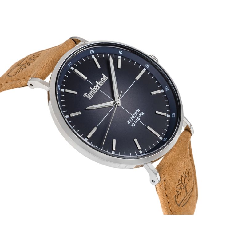 Tarcza zegarka Timberland została zaprojektowana w duchu minimalistycznej elegancji z wyraźnym, outdoorowym akcentem. Utrzymana w głębokim, granatowym odcieniu, posiada subtelne, promieniste wykończenie, które delikatnie rozchodzi się od środka i efektownie pracuje ze światłem.