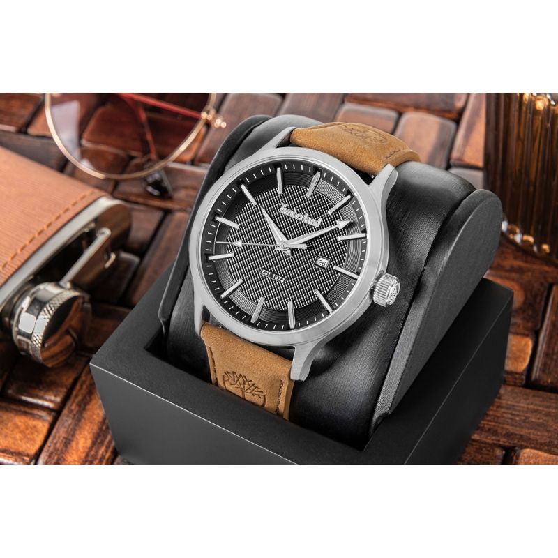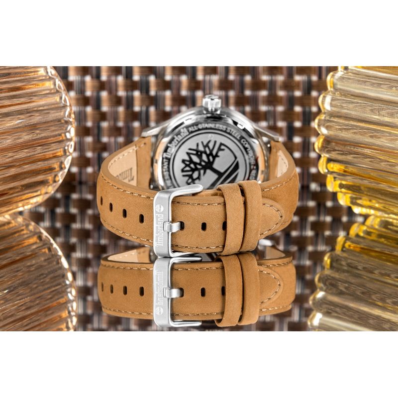 Model został osadzony na nubukowym pasku w naturalnym, ciepłym odcieniu. Miękka, matowa struktura nubuku oraz subtelne tłoczenia logo Timberland podkreślają outdoorowy charakter zegarka i zapewniają wysoki komfort noszenia.