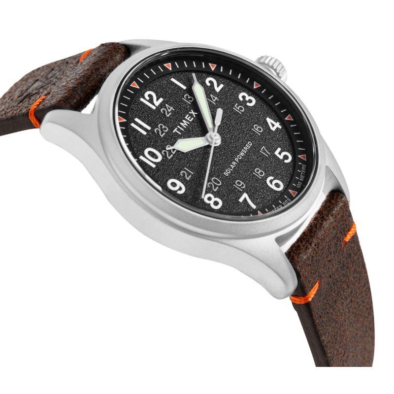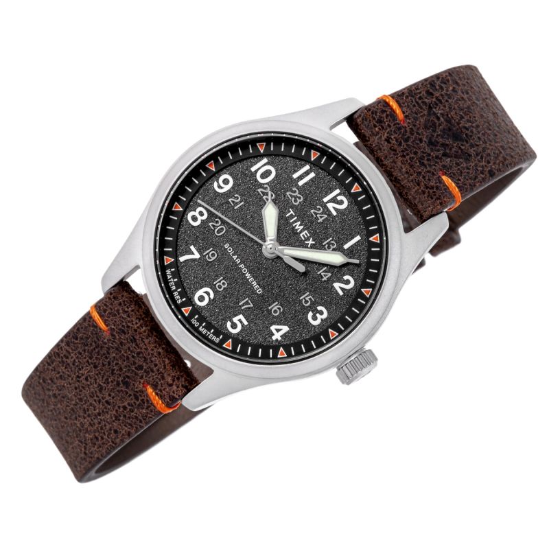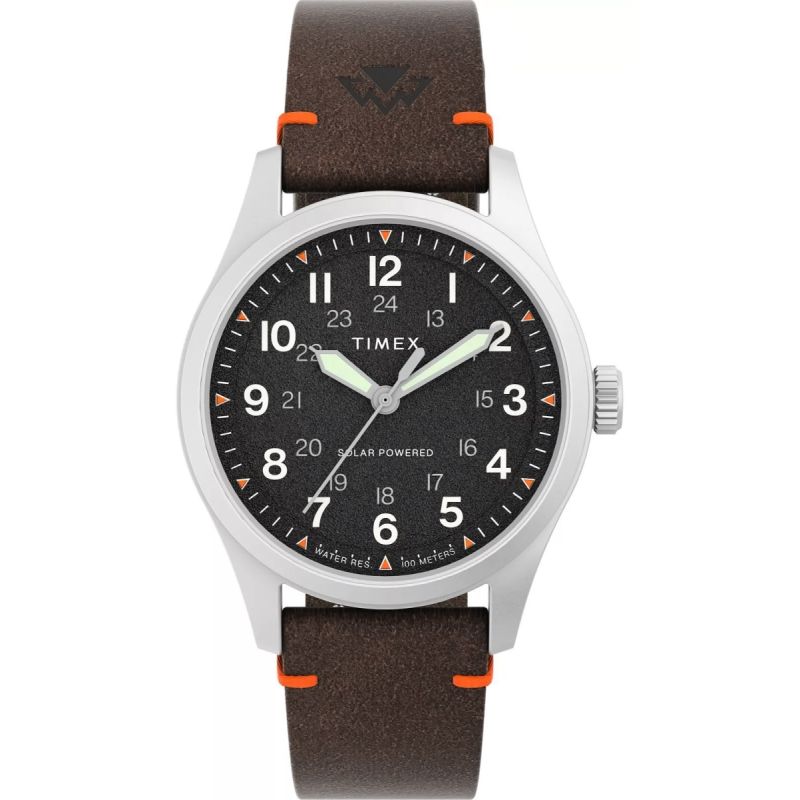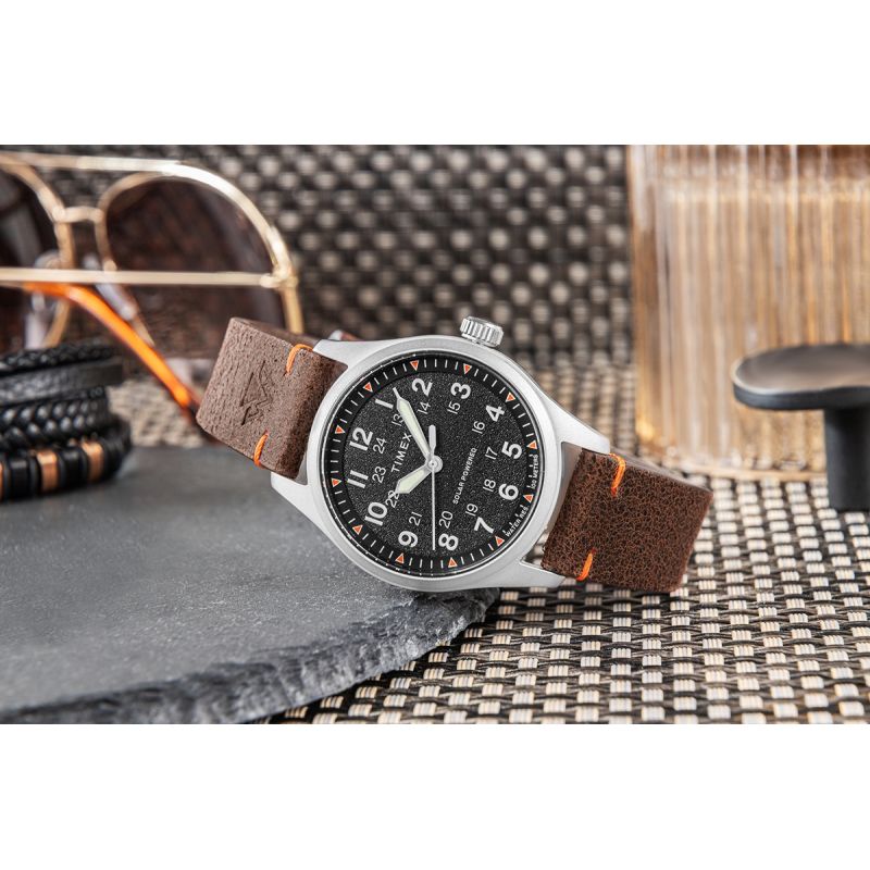 Koperta w matowym wykończeniu podkreśla surowy styl zegarka, a całość osadzono na pasku z naturalnej skóry o wyraźnej, lekko postarzonej fakturze. Charakterystyczne, pomarańczowe przeszycia dodają mu outdoorowego klimatu i wyróżniają go wizualnie.